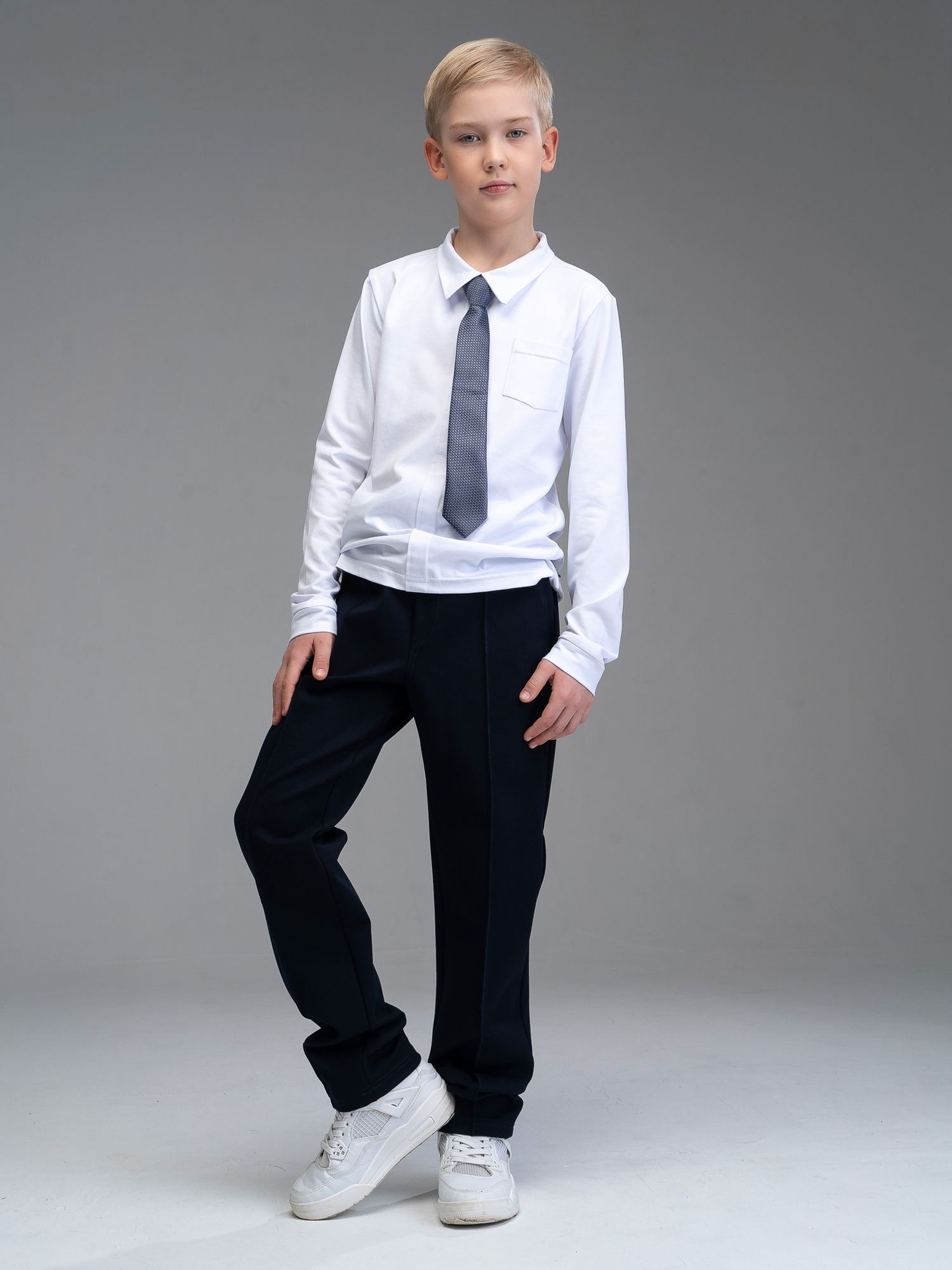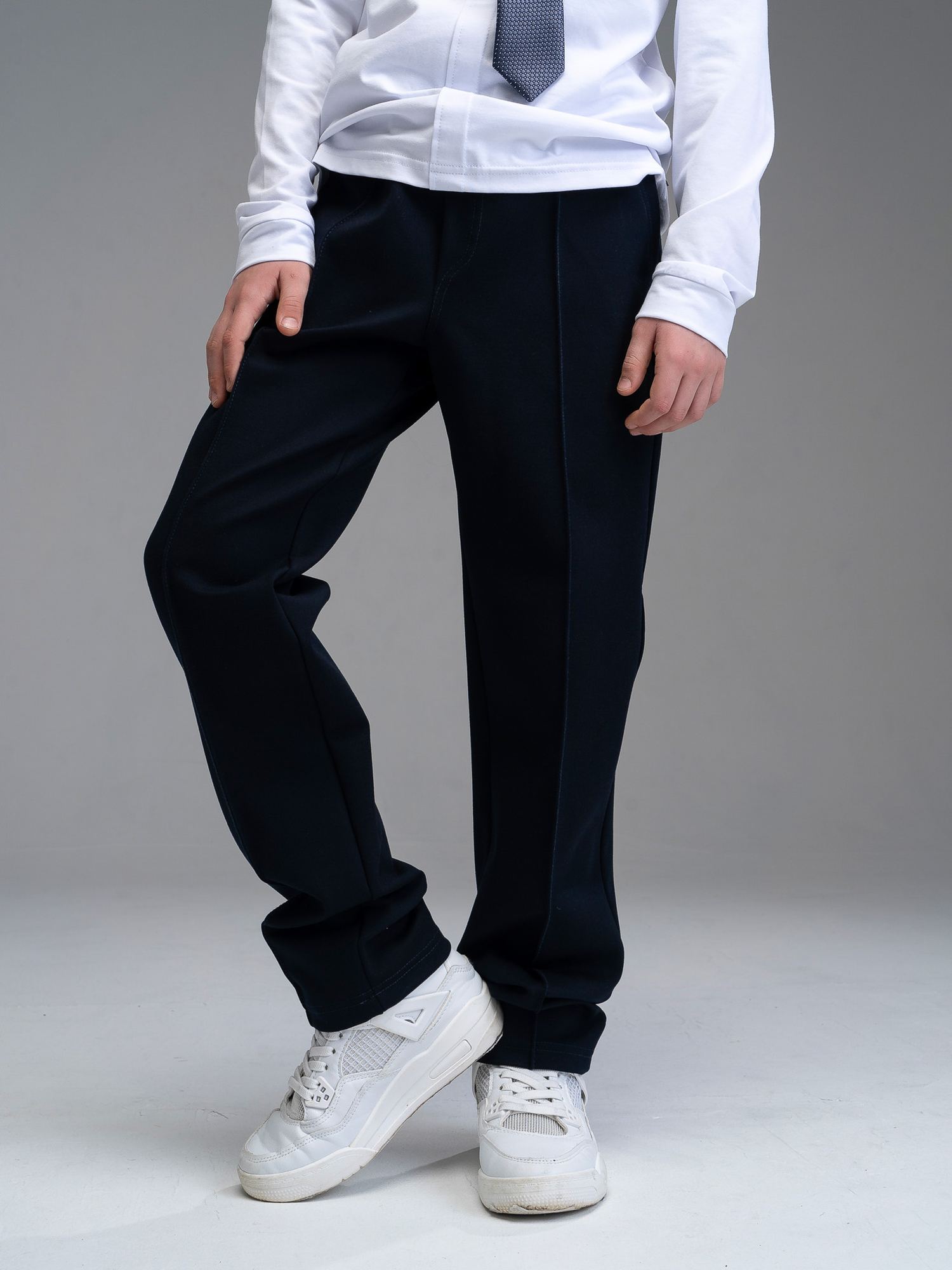 Школьные брюки "унисекс" из джерси темно-синего цвета прямого силуэта с боковыми карманами и имитацией гульфика . Детские брюки выполненые из трикотажа премиального качества - ПЕНЬЕ, с содержанием хлопка 92% .Брюки очень комфортны - без молнии и пуговиц, на эластичном поясе. Брюки на резинке не давят на живот, их легко снимать, переодеваясь на физкультуру. Трикотажные брюки имеют застроченные складки - Вам не придется каждый вечер отглаживать стрелки. Классические брюки при необходимости можно носить с ремнем, для этого на поясе имеются шлевки. Трикотажные хлопковые штаны приятны к телу, в них Вашему ребенку не будет жарко целый день сидеть за партой, а также они очень легки в уходе. Детские брюки идеально подойдут как для непоседливых учеников начальных классов, так и для страшеклассников, Трикотаж не мнётся и хорошо сохраняет форму при длительной носке. Изделие выполнено из трикотажа премиального качества - ПЕНЬЕ.