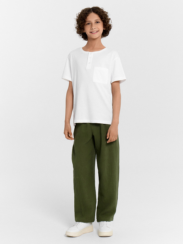 Брюки для мальчиков из ткани (муслин). Брюки длинные с классической линией талии. Силуэт прямой, брюки заужены немного к низу. Пояс цельнокроеный. Верхний срез брюк