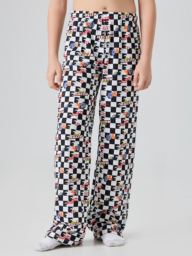 Брюки домашние для мальчиков, длинные и прямые. Детали переда и сидения соеденены боковым швом. Пояс цельнокроеный с эластичной тесьмой внутри (внутрення резина Rv30), ширина 30 мм.