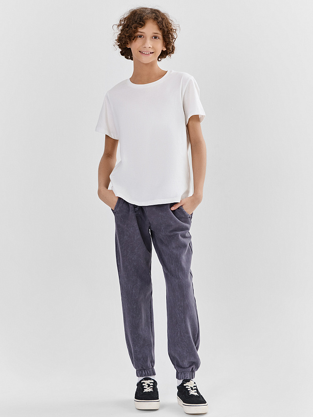 Серые брюки-джоггеры для мальчиков с эффектом acid wash — вещь с лёгким винтажным настроением. Мягкий неравномерный окрас придаёт ткани объём и делает модель визуально интереснее.