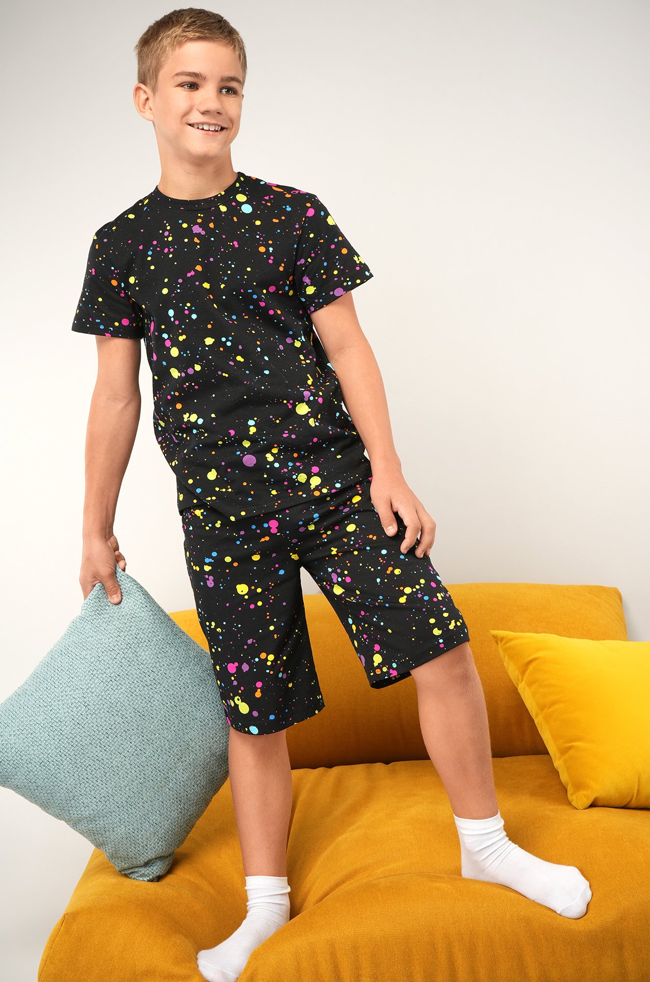 Черный костюм с цветными брызгами подходит для сна и отдыха. Подростковый трикотажный костюм идеален для дома.