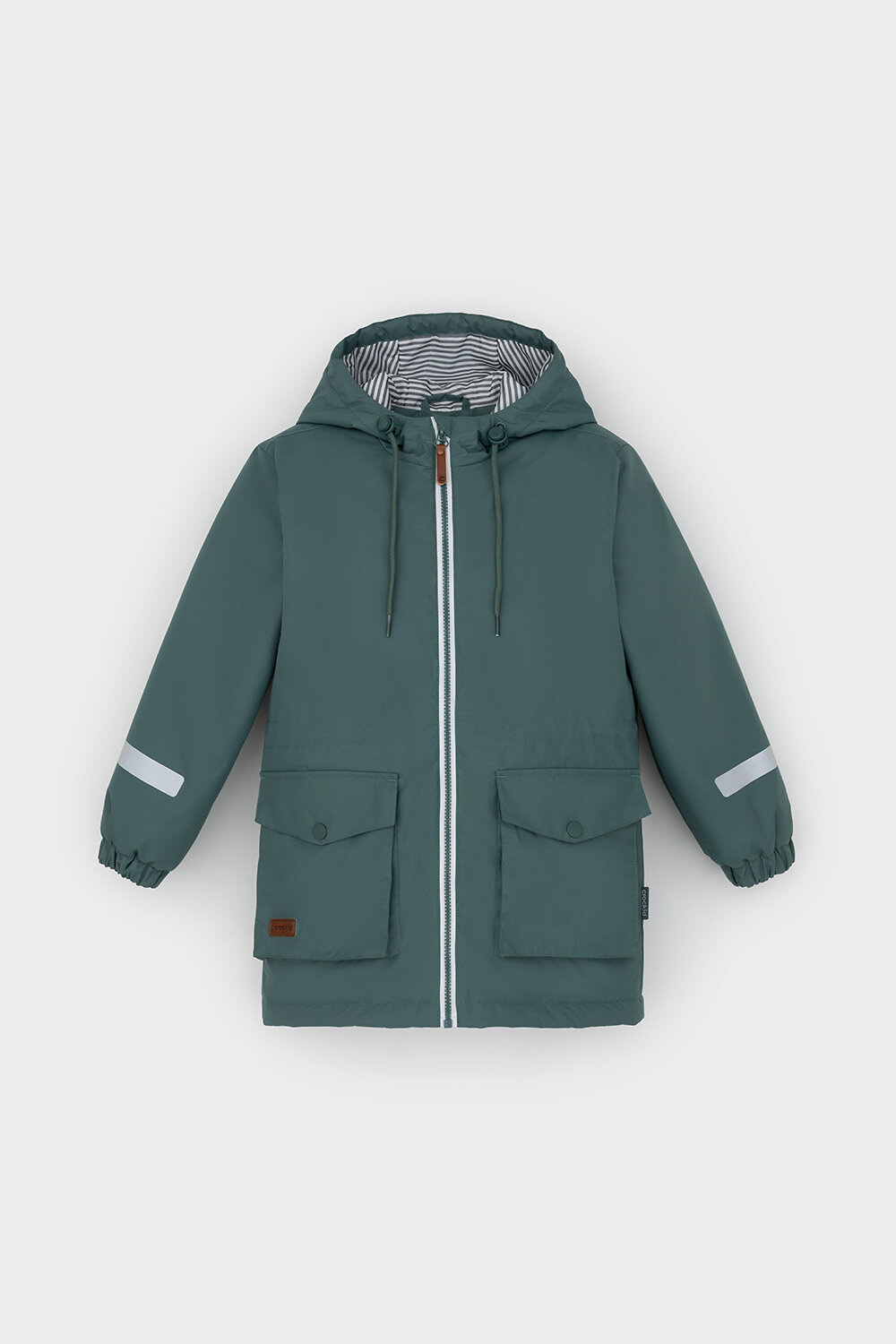 Демисезонная куртка для мальчика с утеплителем SEE®: 120 г/м2. Выполнена из мембранной ткани с дополнительной тефлоновой обработкой. Данный вид обработки предохраняет изделие от загрязнения и лучше отводит влагу. Подклад из 100% полиэстра. У изделия предусмотрена защита подбородка. Несъемный капюшон регулируется с помощью эластичного шнура со стопперами. Низ рукавов изделия имеет эластичную резинку для лучшего прилегания. На талии скрытая утяжка. Спереди два накладных кармана с клапанами на кнопках. Во всех изделиях верхнего ассортимента для безопасности ребенка предусмотрены светоотражающие элементы.