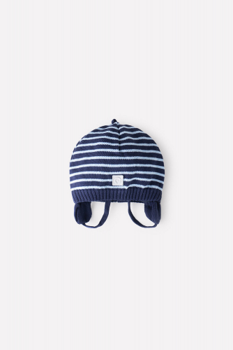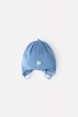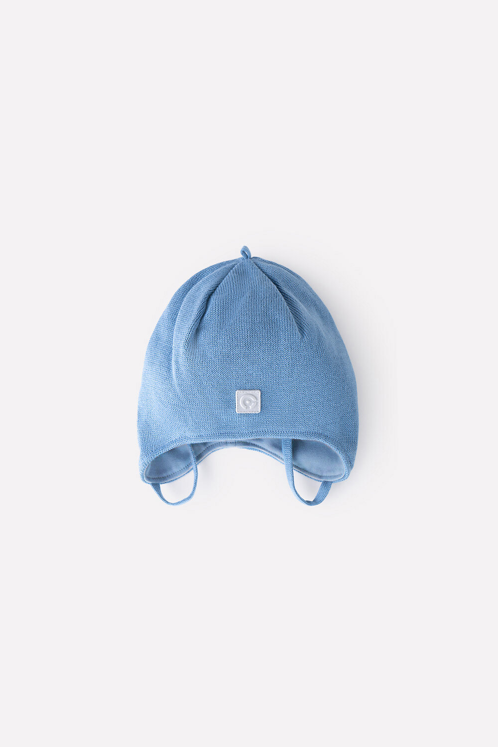 Шапка из хлопковой пряжи на завязках с мягким трикотажным подкладом из интерлока. Связана гладью. На передней части шапочки пришит светоотражатель. На макушке рулик.