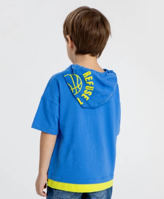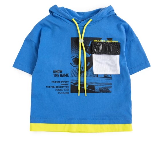 Футболка с капюшоном. Синий цвет и контрастный принт на футболке привлекут внимание окружающих, а салатовые шнурки на капюшоне и окантовка внизу добавят ярких акцентов. Футболка сделана из 100% хлопка. Такой состав и оверсайз силуэт обеспечивают комфорт и свободу движений без прилегания. Капюшон добавляет дополнительный акцент, может защитить от ветра и солнца. Этот предмет гардероба - олицетворение удобства и стиля.
