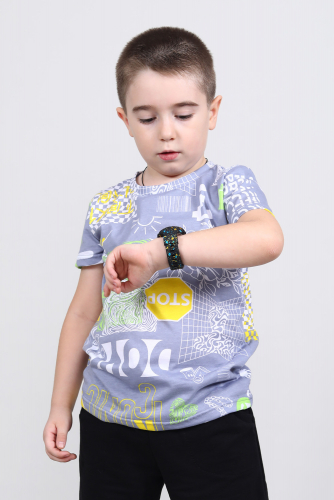 Хлопковая футболка для мальчика с короткими рукавами. Сшита из лёгкого трикотажа кулирка и украшена принтом. Рукава и низ изделия обработаны плоскими швами. На задней части горловины присутствует усиление.
