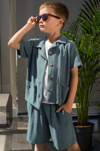 Летний костюм двойка с шортами выполнен в свободном прямом крое, идеально подходящем для активных прогулок и отдыха. Однотонный детский комплект из рубашки и шортиков станет отличным вариантом в сад, на дачу или в гости.