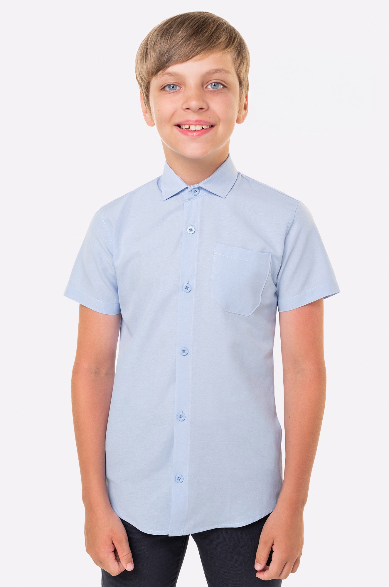 Голубая детская рубашка для мальчика и подростков выполнена из хлопковой ткани. Однотонная школьная рубашка не стесняет движений благодаря прямому крою. Аккуратный отложной воротник, застежка на пуговицы, короткий рукав и карман на груди делают образ сдержанным и опрятным.