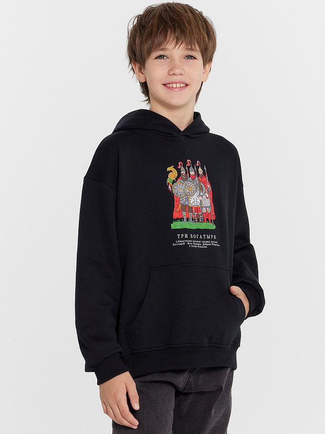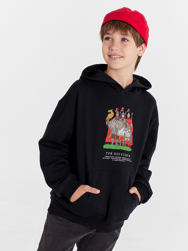 Стильное худи для мальчиков, идеально подходящее для повседневных образов. Модель свободного силуэта с капюшоном обеспечивает комфорт и стиль. Длинные рукава со спущенной линией плеча и эластичными манжетами гарантируют свободу движений и удобную посадку. Карман кенгуру спереди добавляет функциональности и современного стиля. Изделие выполнено из футера - плотного и прочного материала, который отличается хорошей теплоизоляцией и воздухопроницаемостью. Он сохраняет тепло, позволяя коже дышать, что делает его идеальным для прохладной погоды. Этот материал долговечен и устойчив к износу, что особенно важно для активных детей. Это худи станет любимым элементом гардероба каждого мальчика, сочетая в себе стиль, комфорт и практичность.