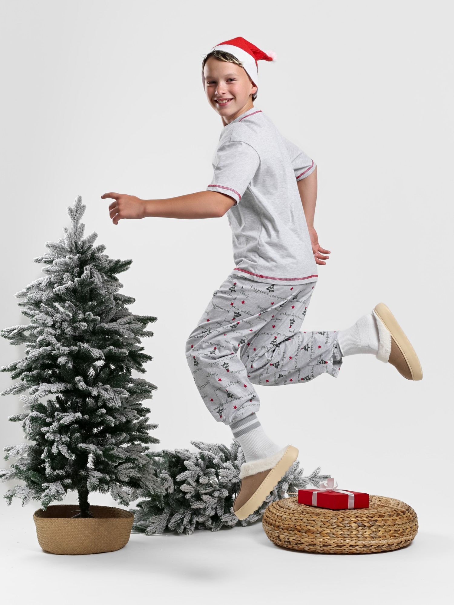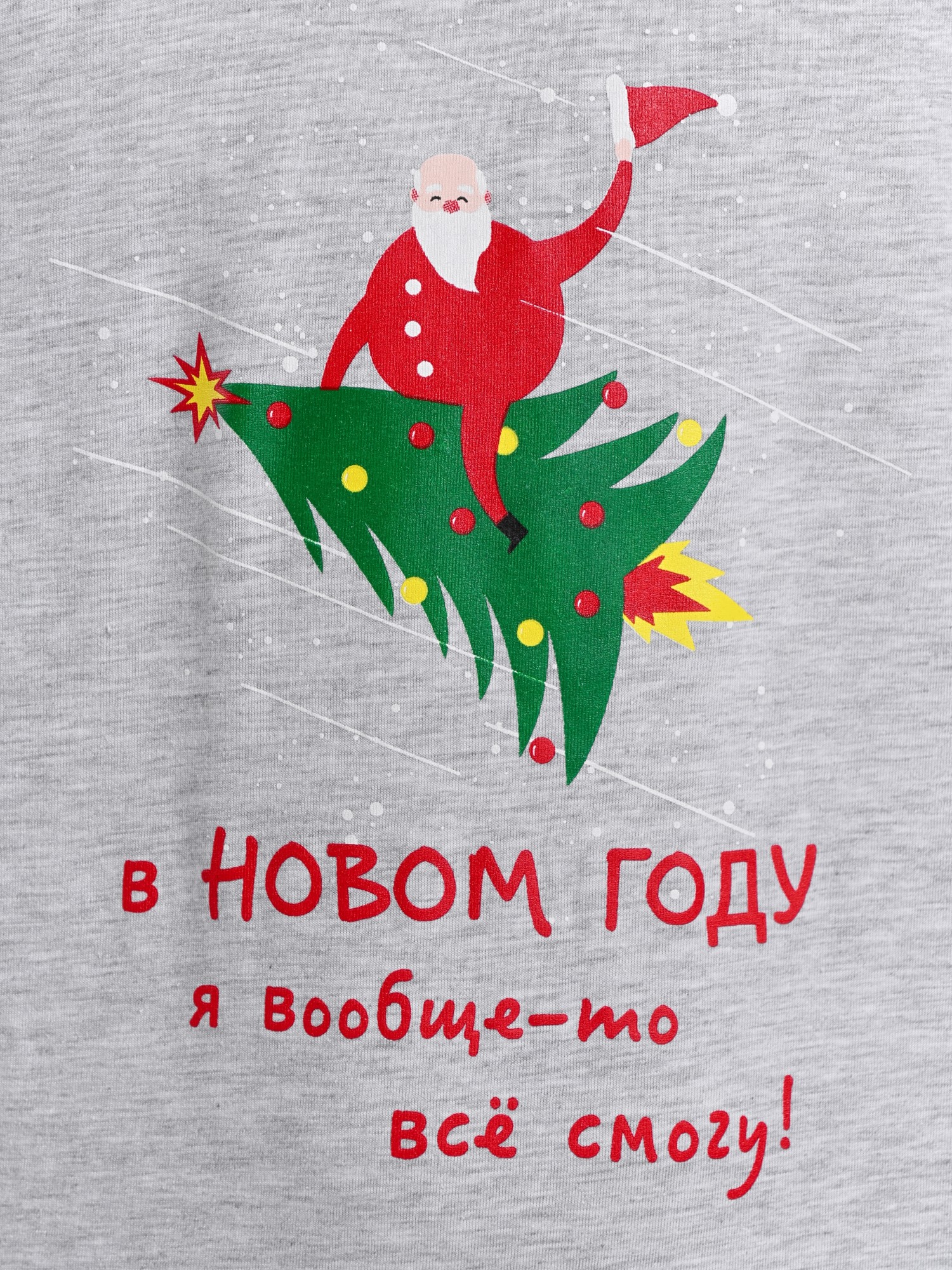 Костюм для мальчика из трикотажного полотна в комбинации двух видов: полотна "кулирка-кармеланж" и полотна "кулирка" с набивным тематическим рисунком на сером фоне , состоящий из футболки и брюк. Футболка - классического силуэта, свободного покроя, с приспущенным плечом, с втачными рукавами длиной до локтя, горловиной овальной формы, обработанной втачной планкой и принтом в центре переда. По шву втачивани я планки настрочена декоративная (5-ниточная) отделочная строчка нитками контрастного цвета Подгибка низа рукавов и изделия так же выполнена с применением декоративной отделочной строчки. Брюки выполнены из полотна с набивным темкатическим рисунком, длинные, умеренной ширины, прямые, с эластичной тесьмой по талии.
