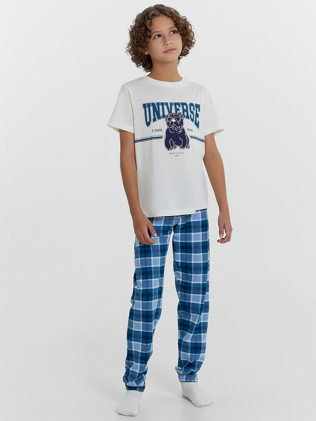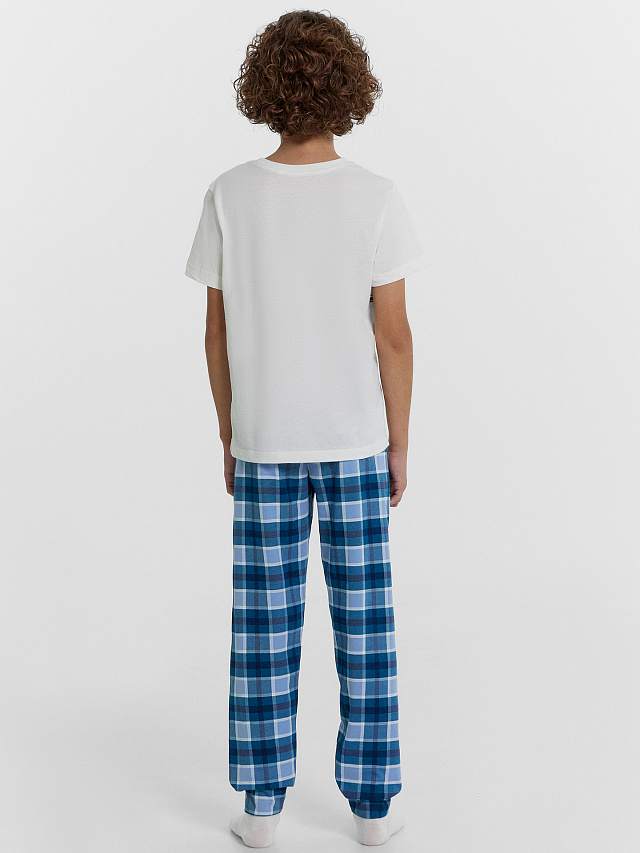 Комплект для мальчиков (футболка, брюки) светло-молочный в бирюзовую клетку
