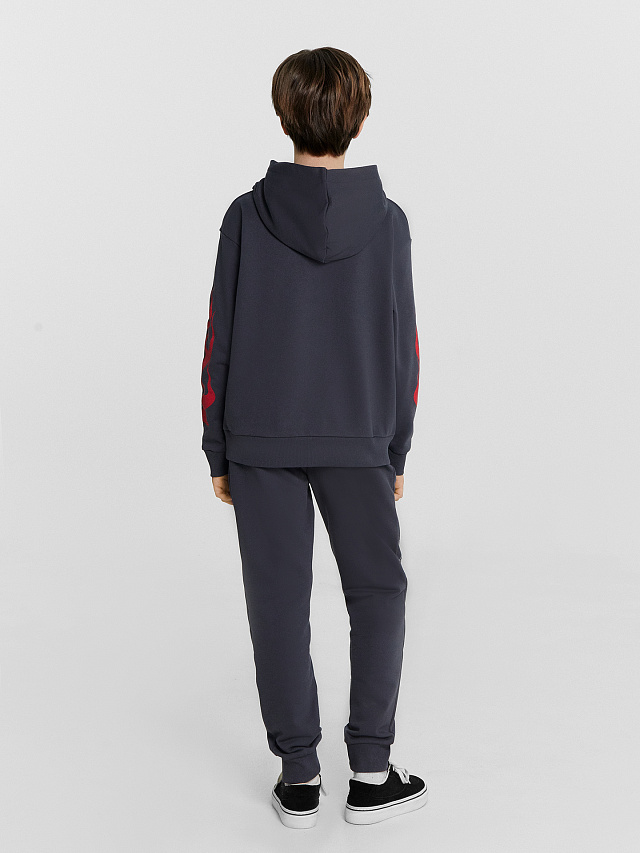 Спортивный костюм для мальчиков из футера без подчеса идеально подходит для активного отдыха и повседневного ношения. Худи свободного силуэта с капюшоном на подкладке из кулирки обеспечивает дополнительный комфорт и защиту от холода. Длинные рукава со спущенной линией плеча и эластичными манжетами по низу, а также притачной пояс из рибаны создают стильный и современный вид. Спереди предусмотрен удобный карман-кенгуру для хранения мелочей или согрева рук. Брюки прямого силуэта с эластичным поясом на кулиске и боковыми карманами обеспечивают максимальное удобство и свободу движений. Низ брюк также выполнен с манжетами из рибаны, что добавляет дополнительного комфорта. Этот костюм отлично подходит для занятий спортом, прогулок и повседневных дел. В линейке представлены различные размеры и цвета, что позволяет подобрать идеальный вариант для каждого мальчика.