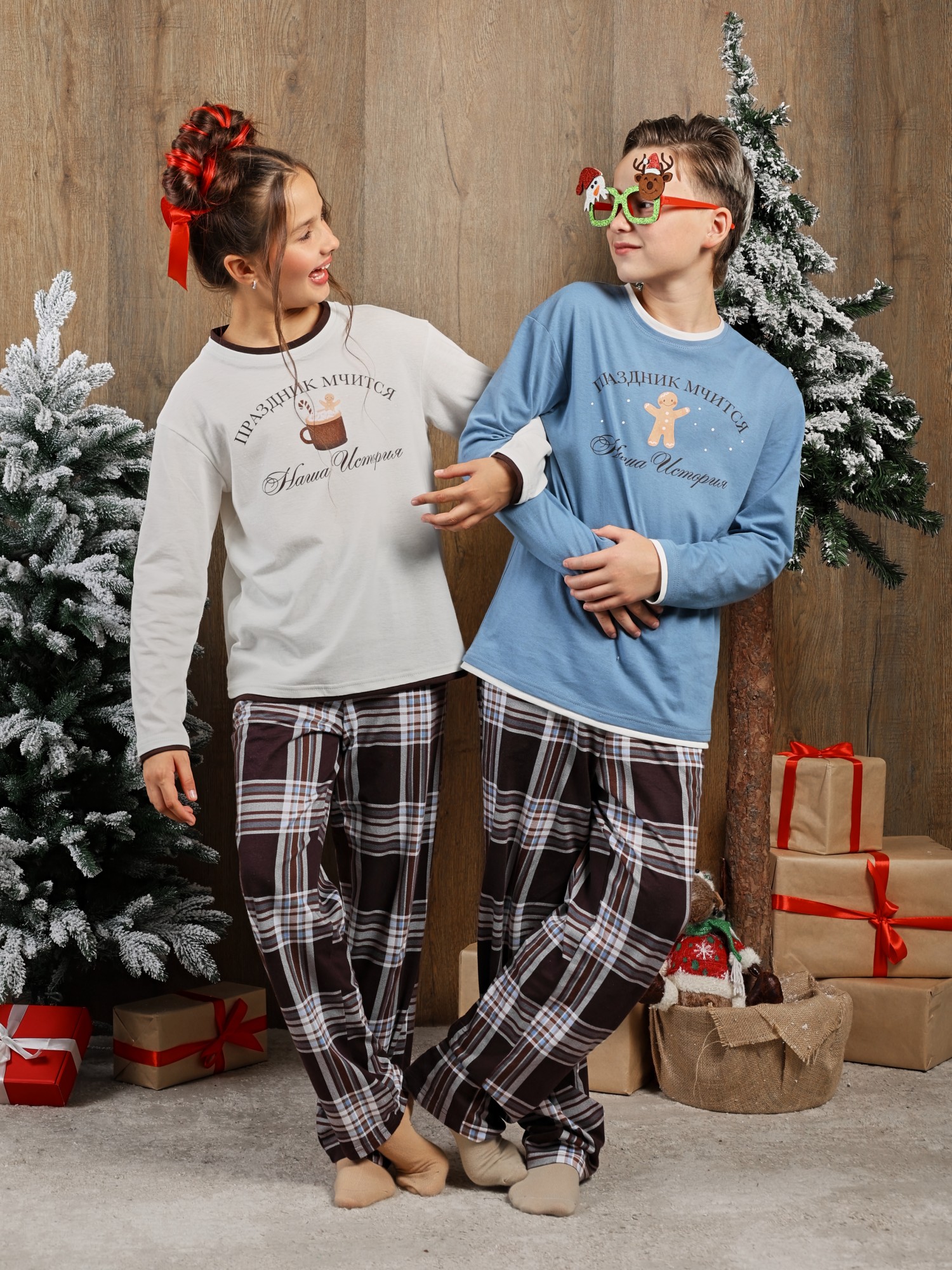 Костюм для мальчика из трикотажного полотна "кулирка" в комбинации двух видов: гладкокрашенного и с рисунком в крупную клетку, сочетающихся между собой по цвету, состоящий из джемпера и брюк. Джемпер - из гладкокрашеного полотна, свободного покроя, с длинными втачными рукавами и приспущенными плечами, с горловиной овальной формы и тематическим принтом, выполненным в технике шелкографии. Горловина, нижние срезы рукавов и низ изделия обработаны подгибкой с отделочным широким кантом контрастного цвета. Брюки - из полотна в клетку, свободного покроя, прямые, на притачном поясе с эластичной тесьмой внутри, с карманами в боковых швах. Нижние срезы обработаны подгибкой.