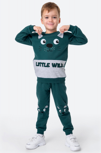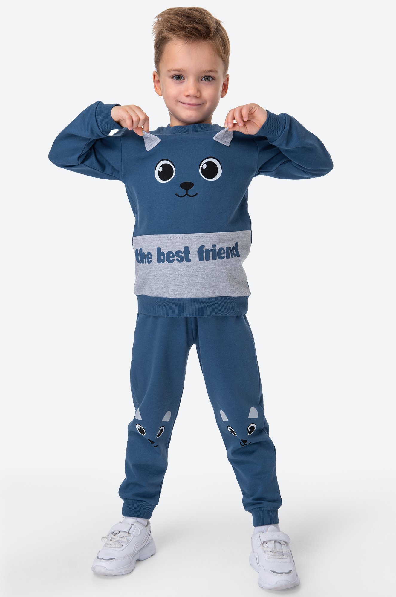 Подарите своему ребенку милый и уютный образ! Темно-синий детский костюм для мальчика с забавным принтом Котик выполнен в прямом крое с круглым вырезом горловины. Мягкий трикотажный комплект из джемпера и штанов создан для маленьких непосед, которым нужна свобода движений.