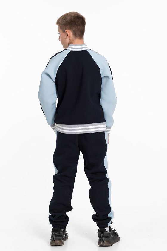 Брюки этого костюма синего цвета с лампасами серо-голубого цвета также имеют боковые карманы, пояс на резинке и шнурке для регулировки посадки, а низ на резинке обеспечивает комфорт при движении.