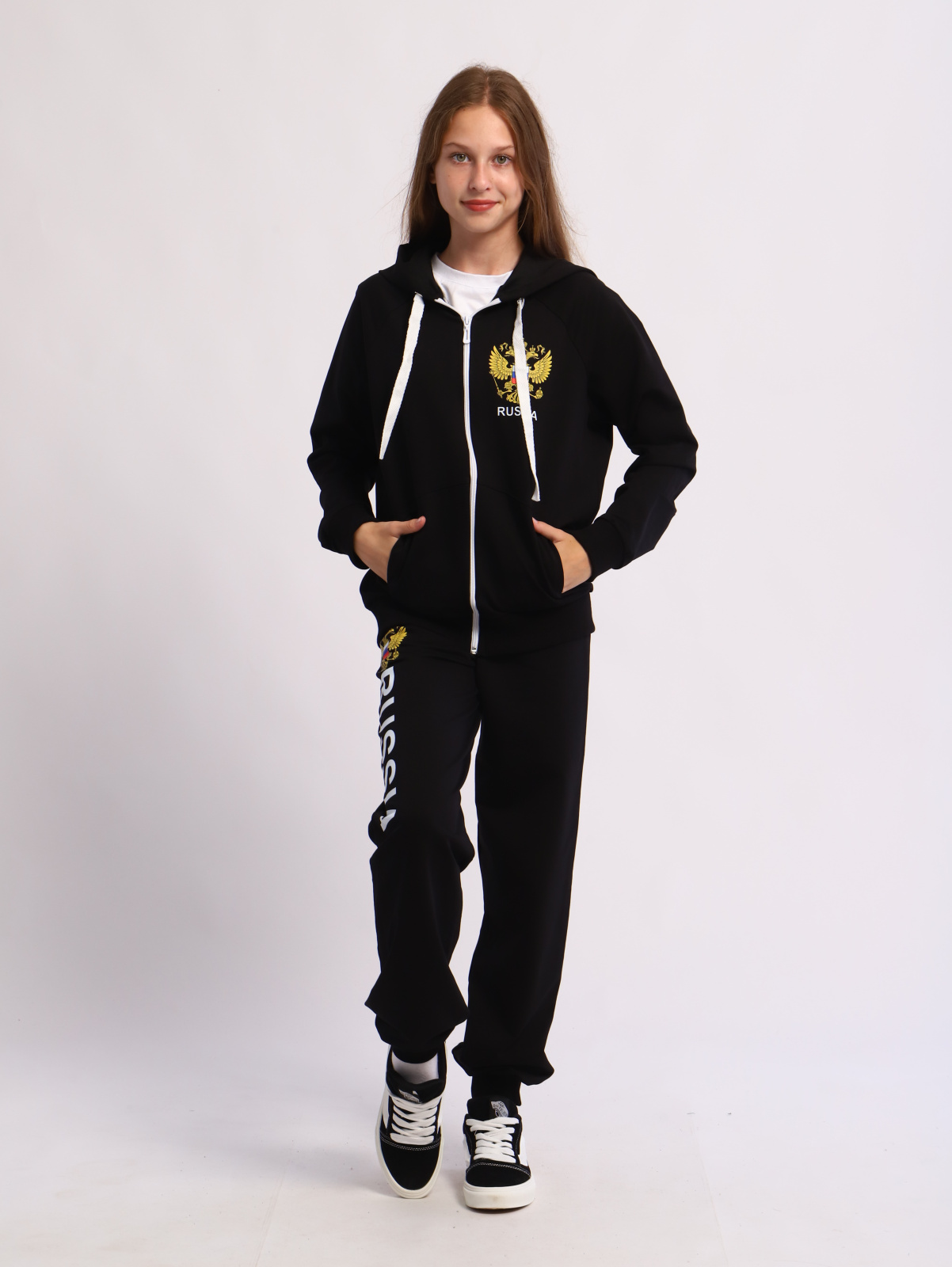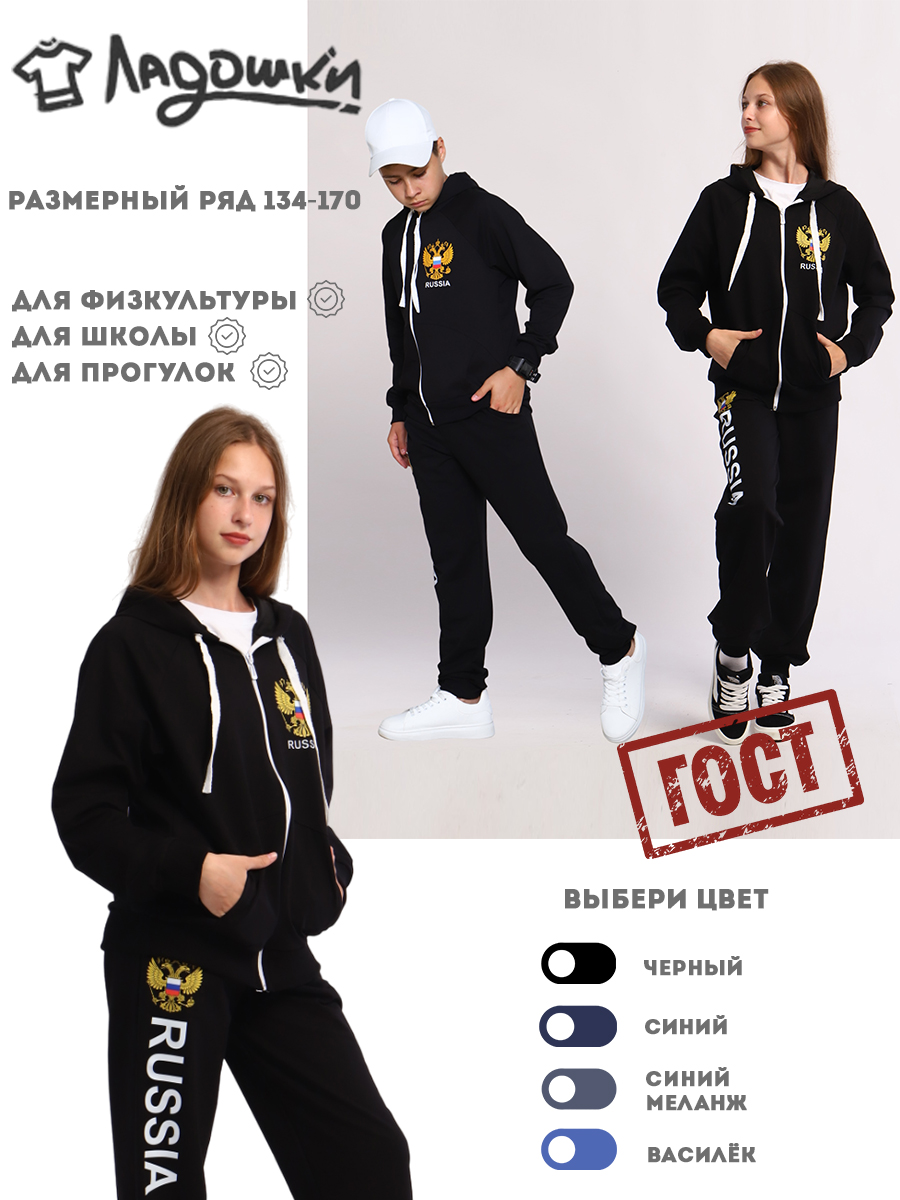 Детский физкультурный костюм с гербом сшит для для мальчиков и девочек подростков. Куртка спортивного костюма двойки на молнии, с капюшоном, на груди герб России (РФ). Брюки джоггеры с манжетами внизу, с поясом на резинке и шнурком для фиксации на талии, на правой ноге крупная надпись "RUSSIA". Комплект сшит из тонкого без начеса трикотажа для весны и лета, прогулок и походов, пикников. Для активного отдыха и занятий спортом на свежем воздухе. Отличается подростковый комплект-двойка своим стильным и в то же время сдержанным дизайном и удобством. Посадка штанишек для физкультуры средняя, удобная. Модная и функциональная олимпийка с большим объемным капюшоном, может использоваться в качестве отдельного верха на лето . Рукава молодежного спортивного костюма - реглан. Спереди карманы "Кенгуру". Костюм детский спортивный в темной серой черной гамме прекрасно подойдет для активных занятий физкультурой в школе и игр, для путешествий и туристических походов. Для командных игр и тренировок, на летний и весенний сезон, теплую осень. Повседневно комплект с худи с капюшоном для юношей и девушек может быть использован тоже. Натуральный состав - это еще одно преимущество комплекта одежды черного цвета , ведь он гарантирует комфорт и практичность. Цветной школьный тренировочный комплект для занятий физкультурой в спортивном зале - практичный, немаркий. Подойдет трикотажный костюм и высоким школьникам, поскольку размерный ряд до 170 роста. Если Ваш ребенок активный, любит играть в "войнушки", участвует в спортивном ориентировании, любит походы, составляет компанию папе на рыбалке, то этот костюм будет ему замечательным подарком! Это прекрасный полезный подарок активному мальчику или девочке!