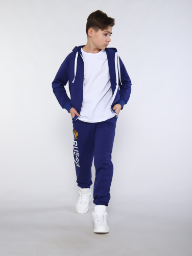 Спортивный костюм: кофта прямого кроя на молнии, боковые карманы, рукава с манжетами.