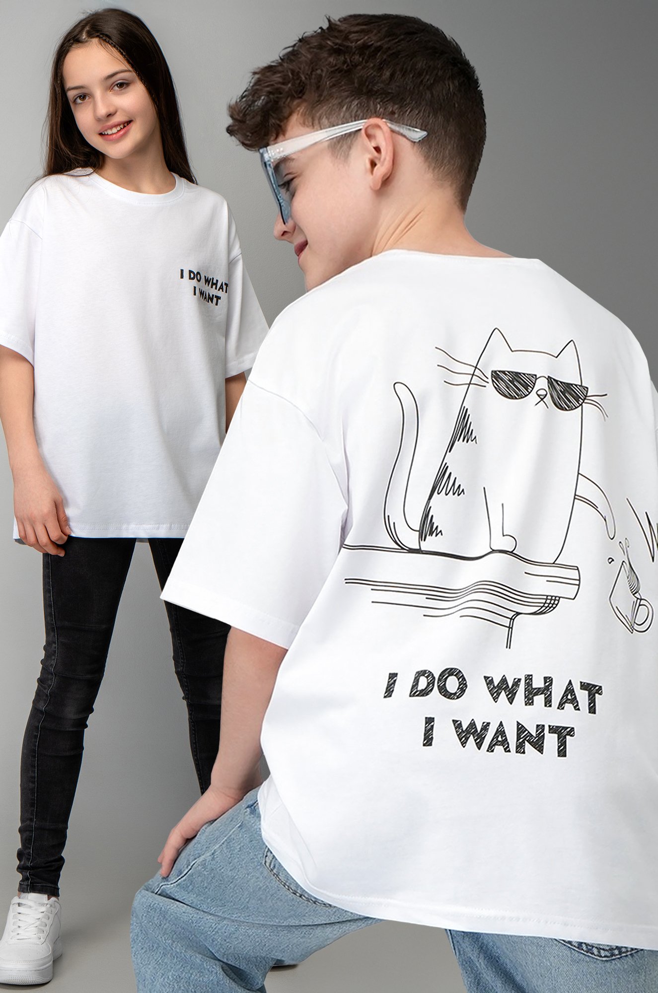 Футболка оверсайз для девочек, мальчиков и подростков выполнена из 100% хлопка. Детская футболка представлена в белом цвете и украшена прикольным рисунком на спине.