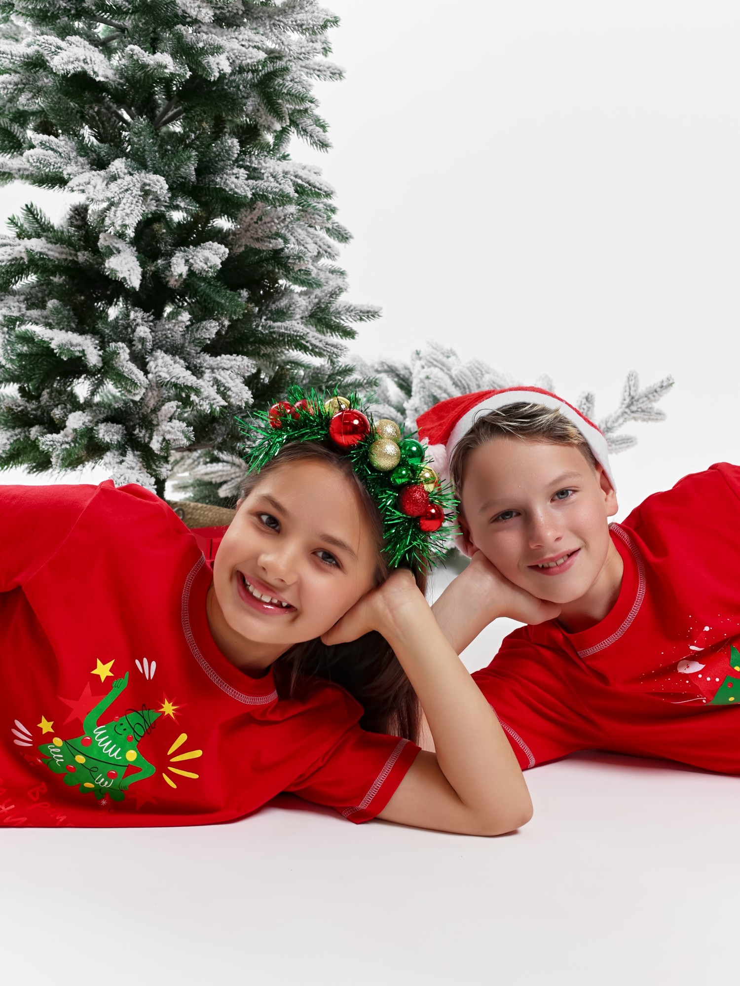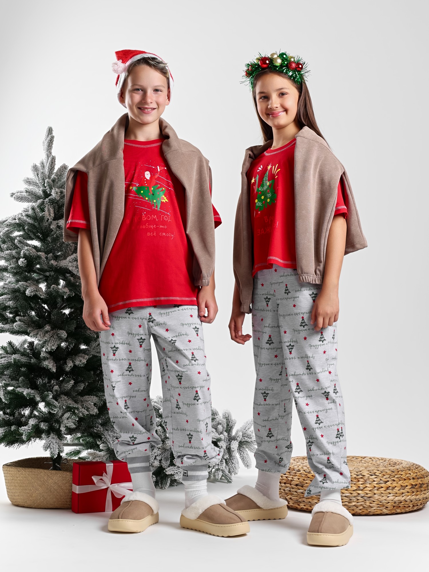 Костюм для мальчика из трикотажного полотна "кулирка" в комбинации двух видов: гладкокрашенного красного цвета и с набивным тематическим рисунком на сером фоне , состоящий из футболки и брюк. Футболка - классического силуэта, свободного покроя, с приспущенным плечом, с втачными рукавами длиной до локтя, горловиной овальной формы, обработанной втачной планкой и принтом в центре переда. По шву втачивани я планки настрочена декоративная (5-ниточная) отделочная строчка нитками контрастного цвета Подгибка низа рукавов и изделия так же выполнена с применением декоративной отделочной строчки. Брюки выполнены из полотна с набивным темкатическим рисунком, длинные, умеренной ширины, прямые, с эластичной тесьмой по талии.