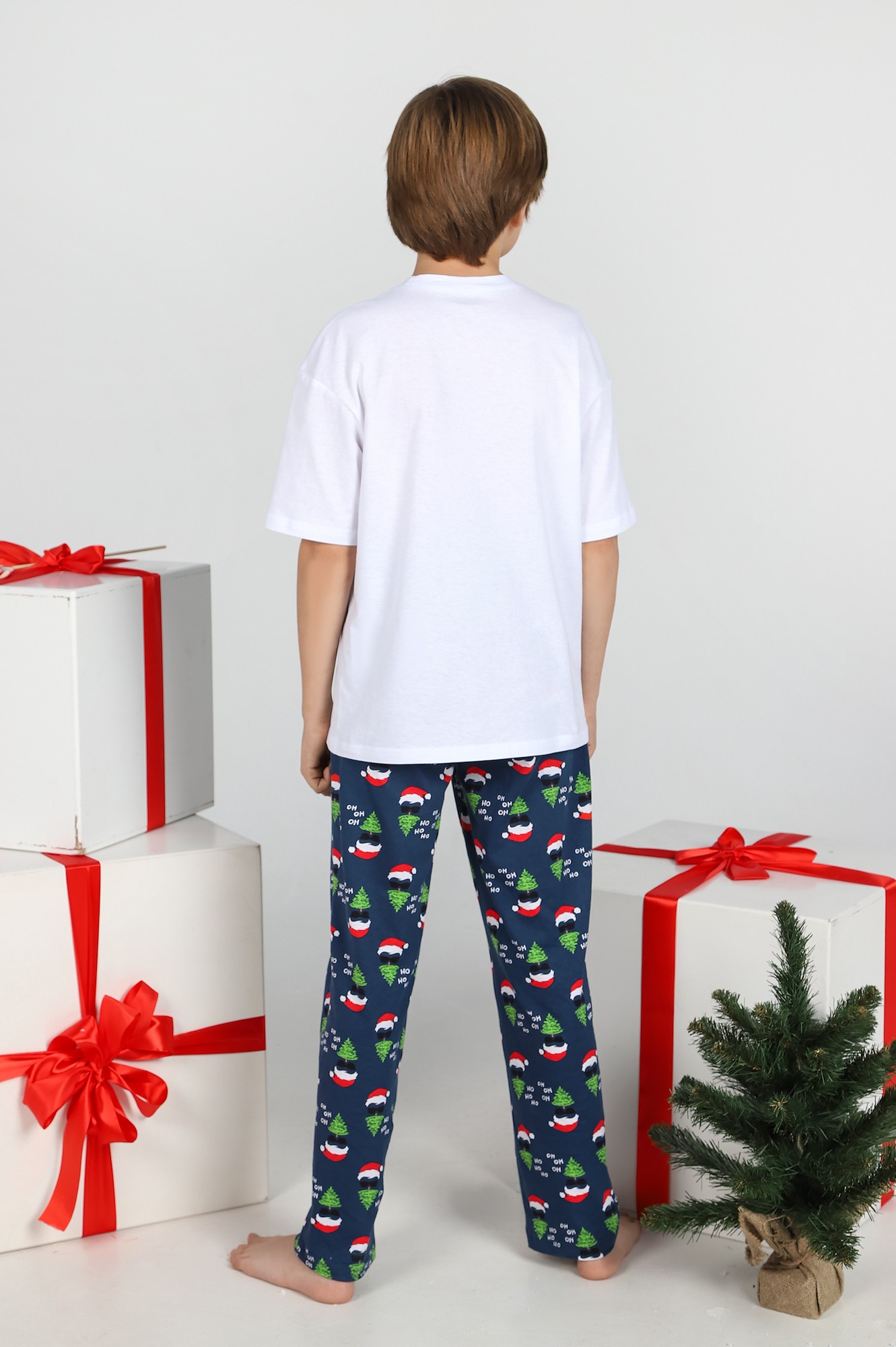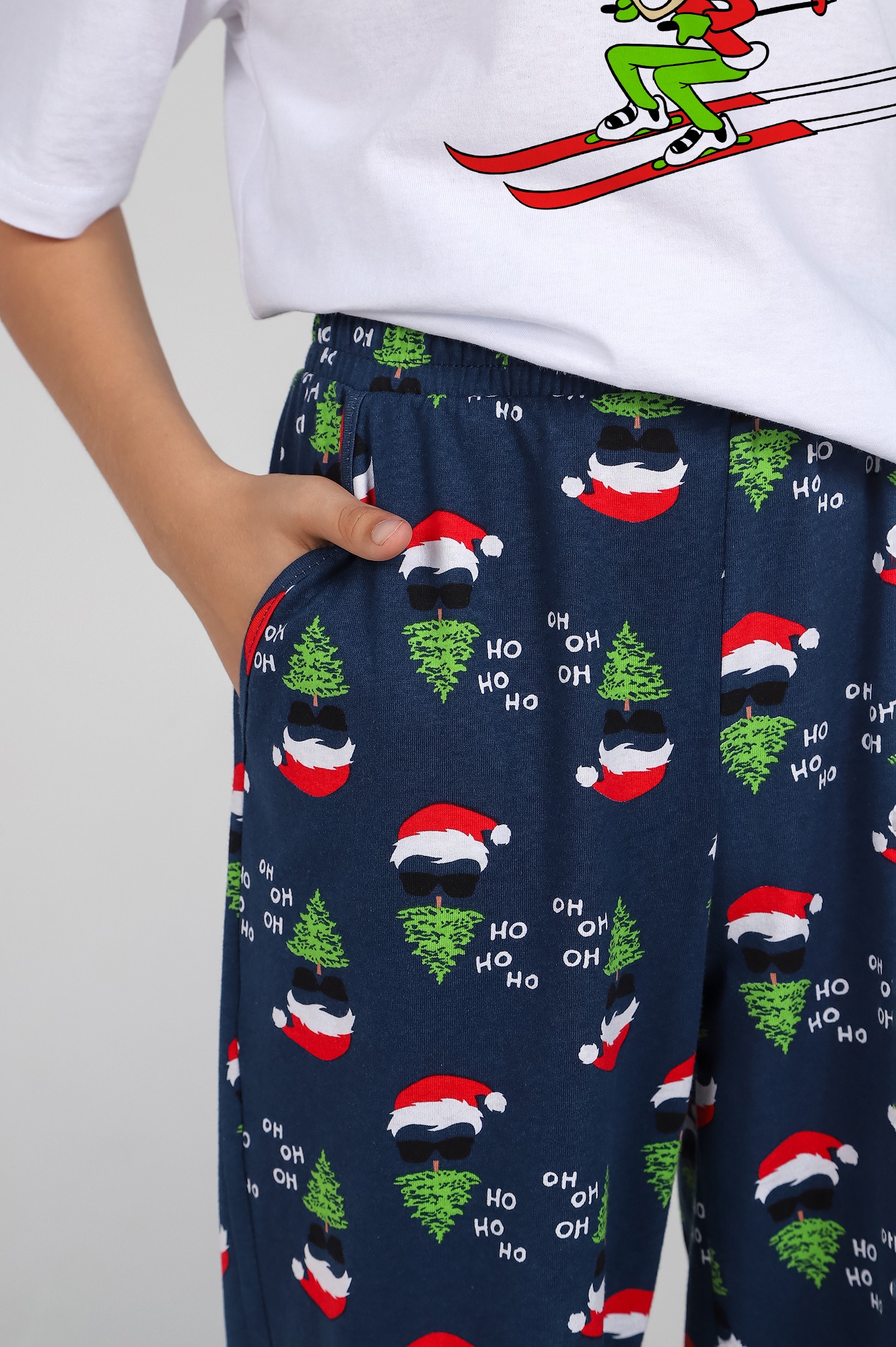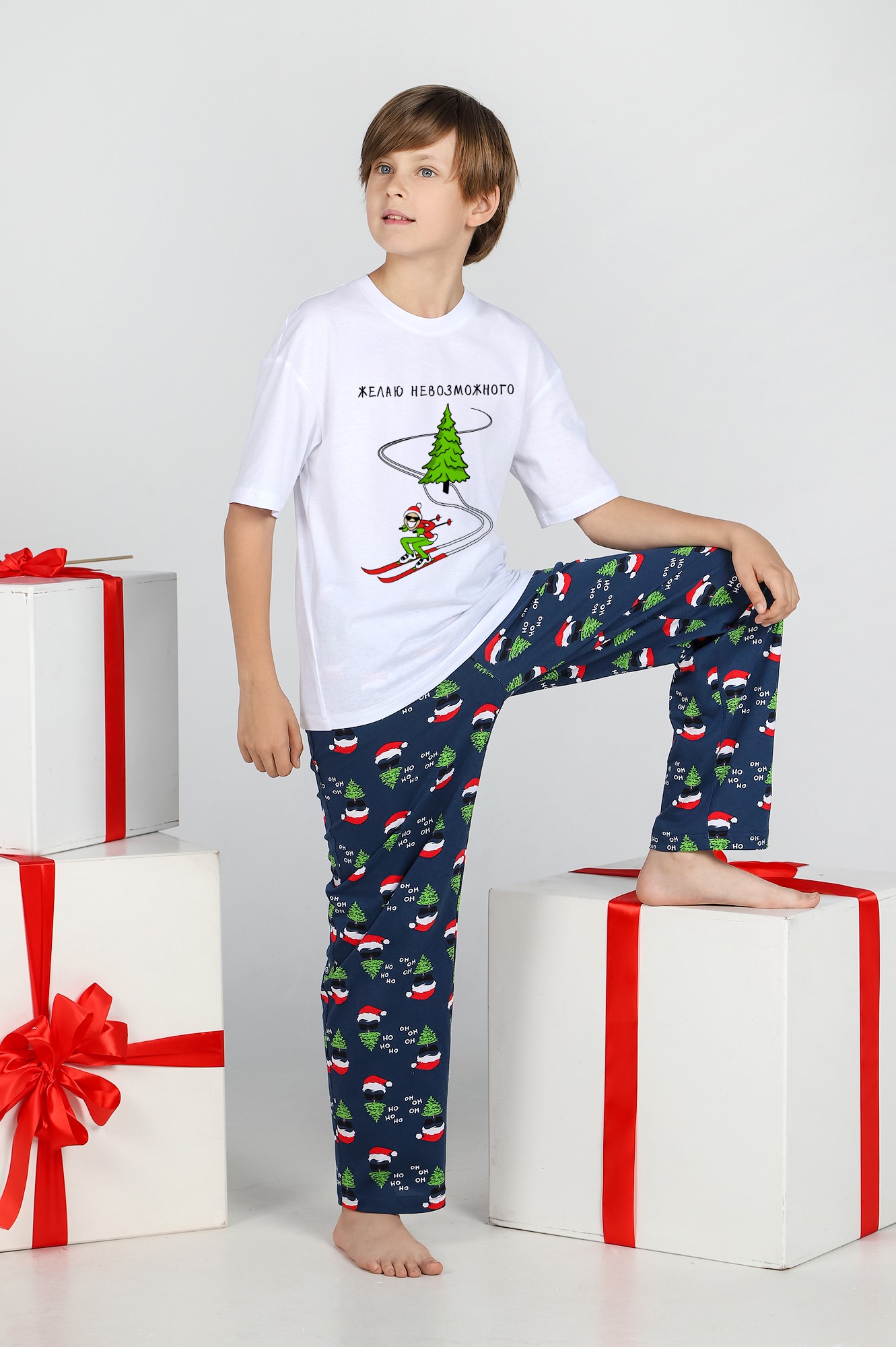 Костюм для мальчика, состоящий из футболки и брюк.Футболка - из гладкокрашеного полотна с принтом на детали переда, классического покроя, с короткими втачнвыми рукавами, удлиненными плечевыми швами и горловиной овальной формы, обработанной втачной планкой. По шву втачивания планки в горловину настрочена отделочная строчка. Нижние срезы рукавов и изделия обработаны швом вподгибку. Брюки - из полотна с набивным рисунком, длинные, на притачном поясе с эластичной тесьмой внутри и карманами в боковых швах. Нижние срезы обработаны швом вподгибку.