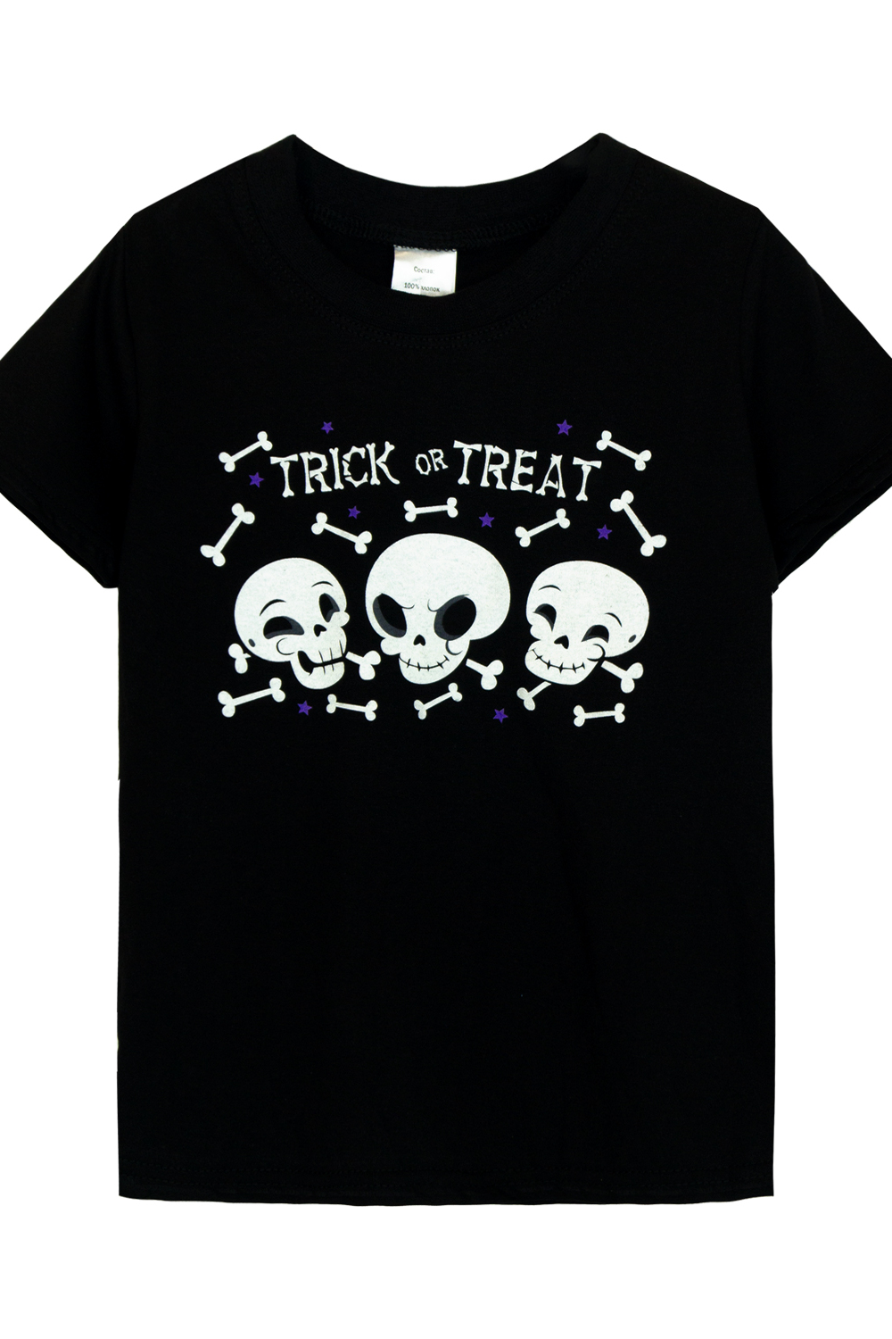 Футболка детская прямого силуэта с в тачным коротким рукавом. Горловина круглая обработана воротником из рибаны в цвет изделия. Низ изделия и рукавов обработан швом в подгибку. На полочке флуоресцентный принт. Цвет: черный; Материал: кулирка;кулирка; Состав: 100% хлопок.