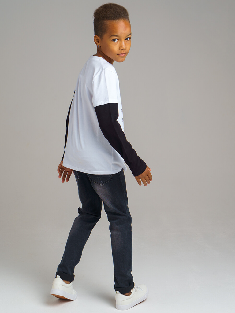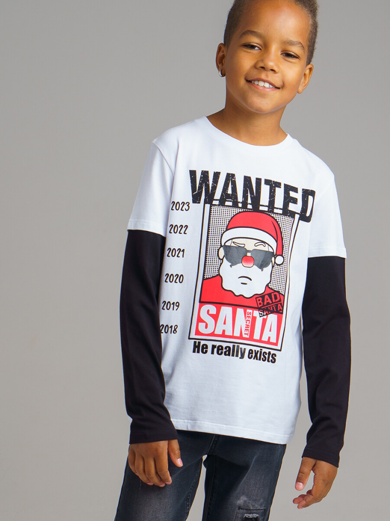Лонгслив из качественного приятного на ощупь трикотажа. Высокое содержание хлопка 95%. Благодаря наличию эластана в составе ткани изделие проще в уходе и держит форму. Рукав с имитацией многослойности. Новогодний принт с акцентно глянцевой текстурой. 95% хлопок, 5% эластан