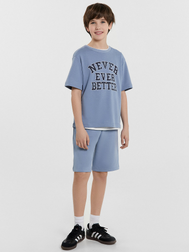 Стильный комплект для мальчиков. Изготовлен из трикотажного футера. Футболка свободного силуэта, длиной до середины бедер, с короткими рукавами и круглой горловиной. Шорты длиной до колена, с эластичной резиной в поясе и регулировочным шнурком. Отличный выбор!