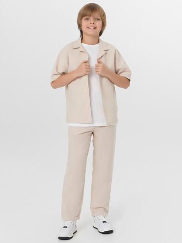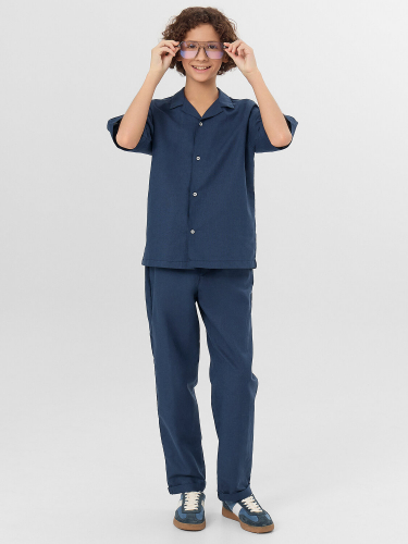 Комплект из двух предметов. Жакет прямого силуэта с воротником. По переду обработана застежка на пуговицы d=10mm и петли. Рукава короткие, втачные, слегка спущены. Нижние срезы изделия и рукавов обработаны швом в подгибку. Брюки прямого силуэта. Посадка средняя. Пояс цельнокроеный с эластичной тесьмой внутри. На поясе пробиты петли, заправлен шнур из основного полотна. По переду имитация гульфика, обработаны карманы с наклонным входом от боковых швов. Низ изделия с отворотами.