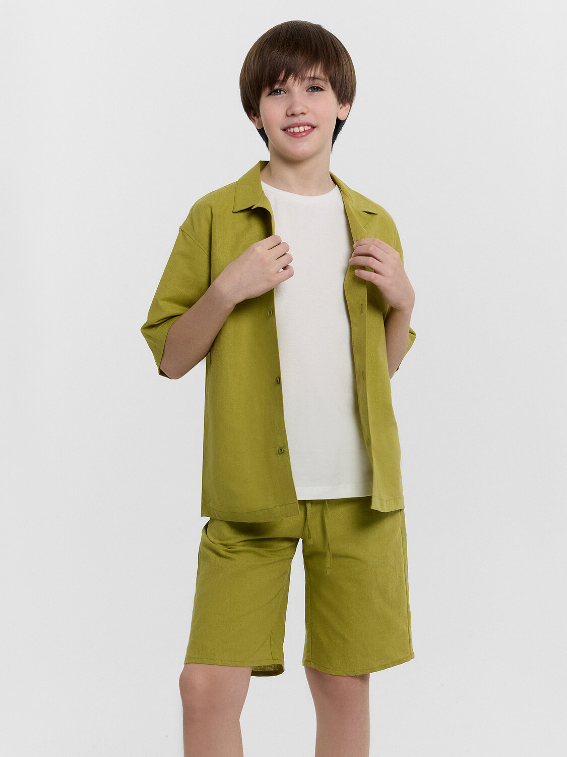 Сорочка верхняя для мальчиков прямого силуэта с воротником. По переду обработана застежка на пуговицы d=10mm и петли. Рукава короткие, втачные, слегка спущены. Нижние срезы изделия и рукавов обработаны швом в подгибку.