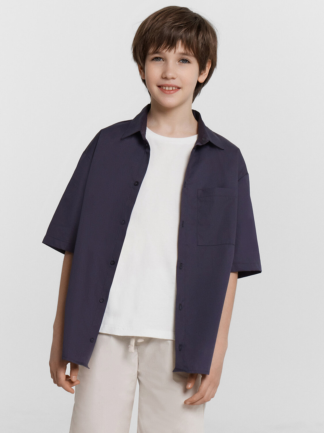 Рубашка для мальчиков прямого силуэта с воротником. По переду обработана застежка на пуговицу d=10mm и петли. На правой детали переда накладной карман. Рукава короткие, втачные, слегка спущены. Нижние срезы изделия и рукавов обработаны швом в подгибку.