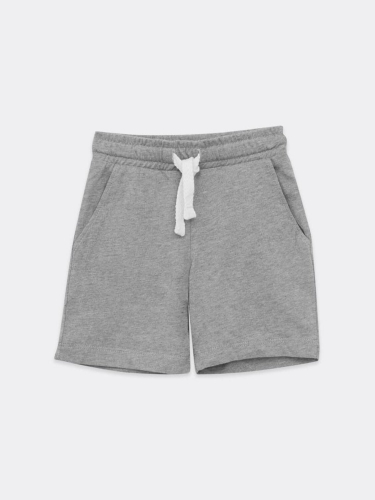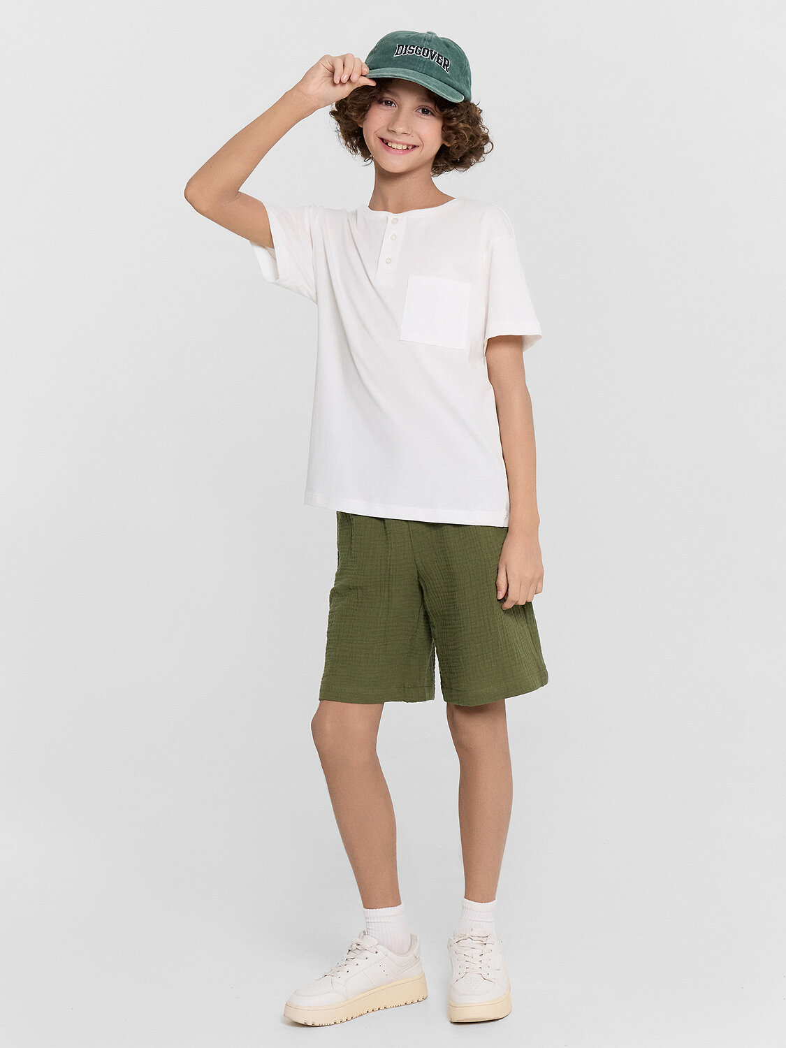 Шорты для мальчиков из ткани (муслин). Шорты с классической линией талии. Силуэт прямой. Пояс цельнокроеный. Верхний срез шорт застрочен с эластичной тесьмой. Карманы в боковых швах (хулиганы). На внешней стороне пояса пробиты петли, втянут шнур из основного полотна. Низ шорт обработан швом в подгибку.