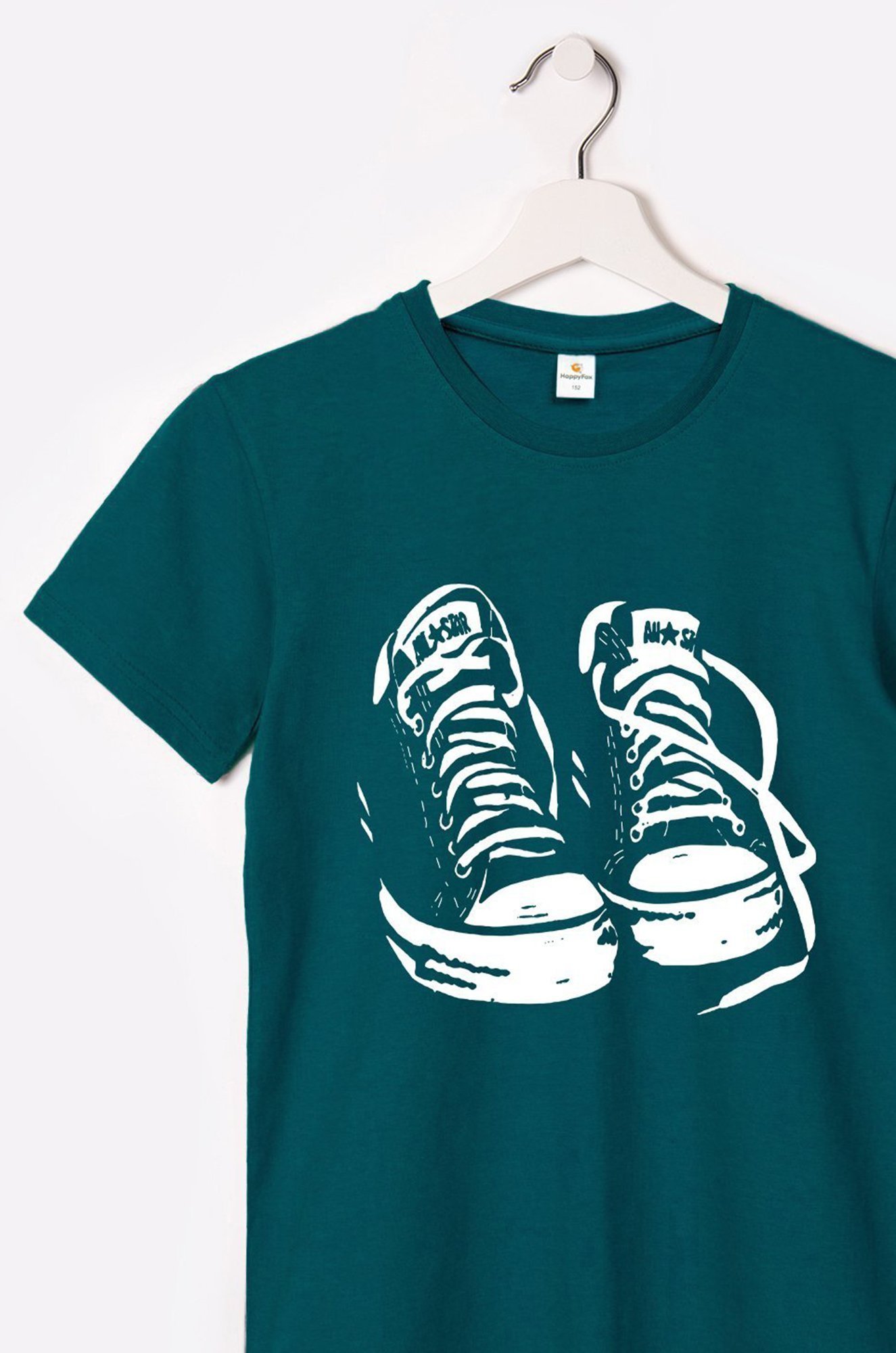 Детская футболка оттенка морской волны выполнена из дышащего 100% хлопка – отличное решение для жарких дней. Рисунок Кеды поднимет настроение и зарядит энергией на весь день!