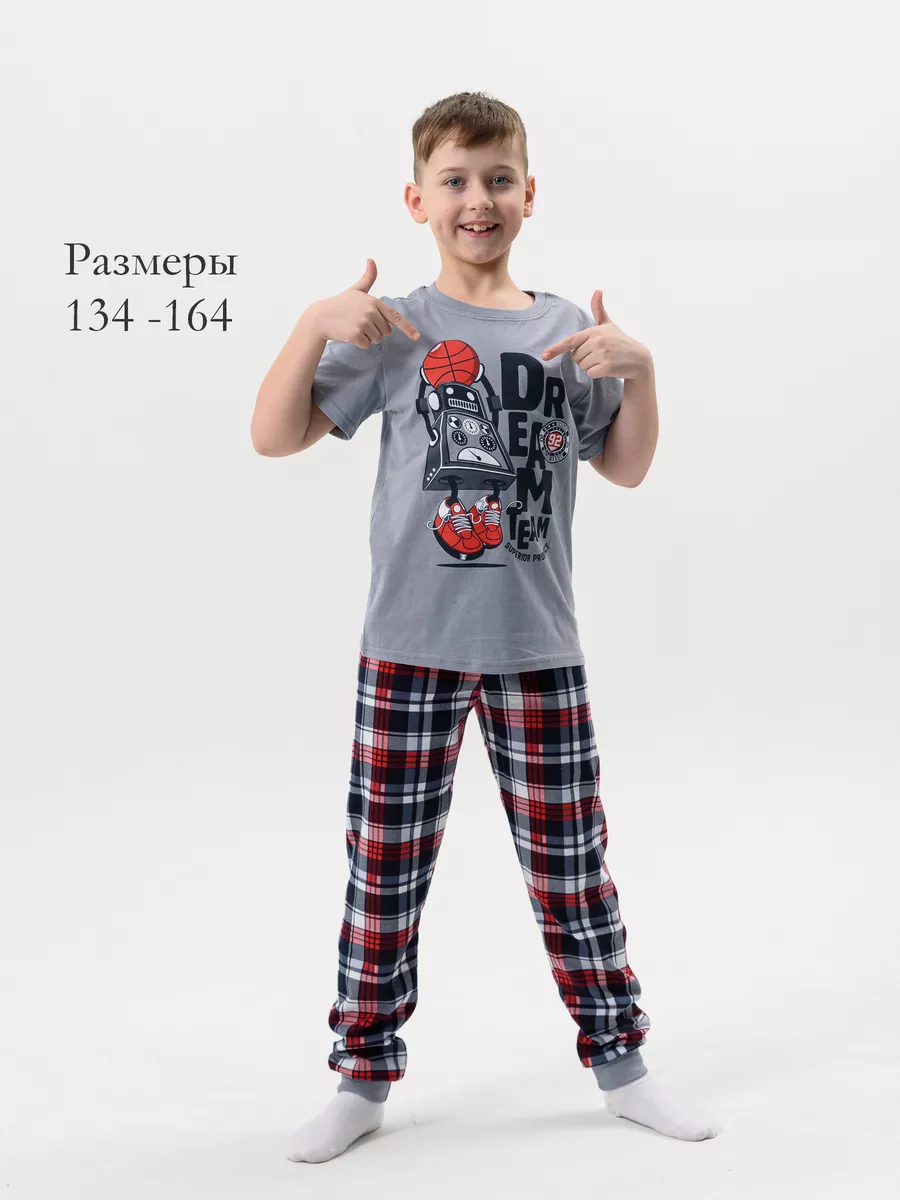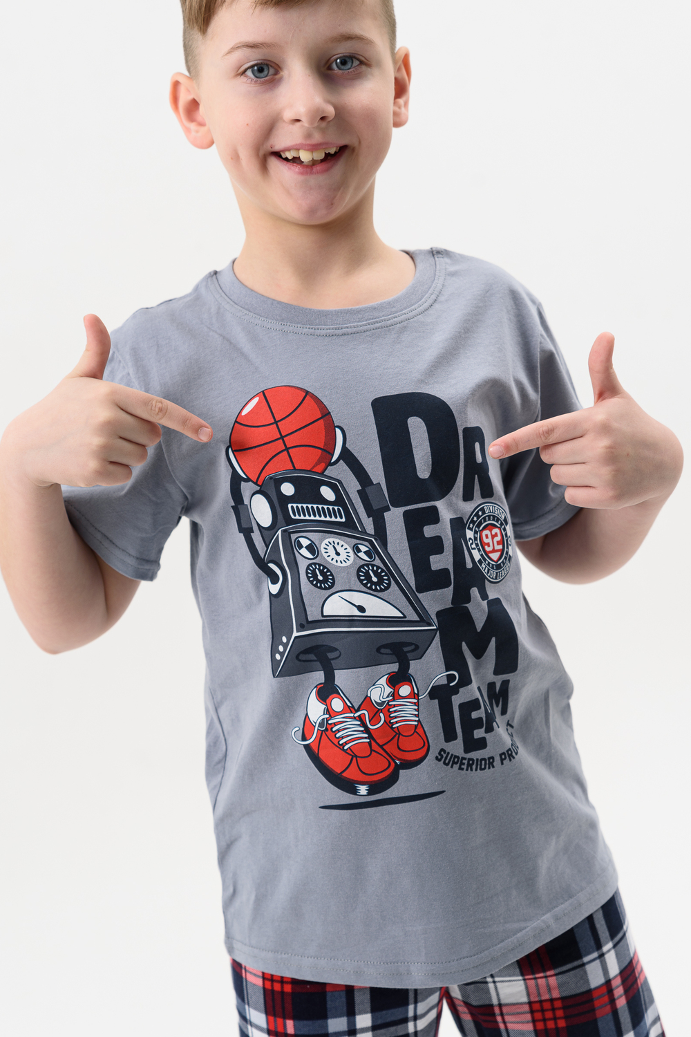 Пижама для мальчика детская, состоящая из футболки и брюк с манжетами, идеальная домашняя одежда. Комплект без карманов из натурального хлопка украшен устойчивой печатью робот. Пижамка с клетчатыми штанами согревает, даже если ребенок ворочается и раскрывается во сне, а также создает ощущение уюта, ребенок спит глубже и реже просыпается. Подходит для полных и худеньких, высоких и невысоких детей. Молодежная удобная двойка с крутым принтом создаст стильный образ для фотосессии или спортивной тренировки. Также стильные пижамы для мальчиков и подростков создают хорошее настроение, их можно носить как домашний или летний пижамный костюм без карманов и застежек, для комфортного сна ребенка. Пижама на мальчика подростка с удобной посадкой и нетугой резинкой, ярким и модным молодежным стилем для детей и подростков. Тысячи довольных покупателей доверяют нам свой выбор благодаря нашим низким ценам, отличному пошиву, высокому качеству и интересным цветовым решениям. Цвет: серый; Материал: кулирка;кулирка; Состав: 100% хлопок.
