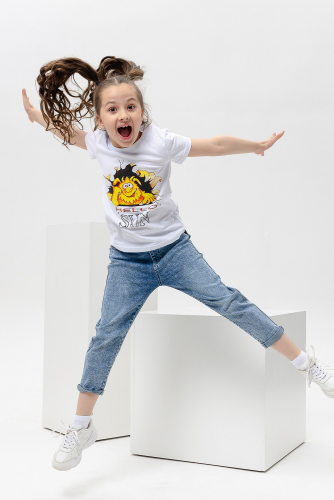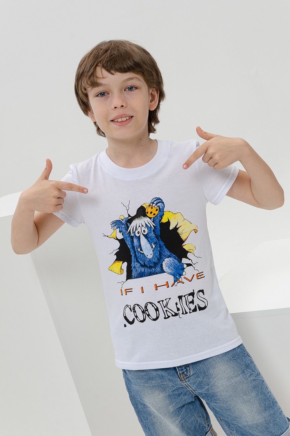 Удобная футболка с забавной печатью. Оригинальное изображение чудаковатого монстра привлечёт внимание как спереди, так и со спины. Белый цвет ткани прекрасно отражает солнечные лучи, что позволяет чувствовать себя комфортно в жаркую погоду. С моделями 18034 и 18036 у вас получится забавная семейная коллекция, а купив своему ребёнку модель 18037, вы разнообразите его гардероб.