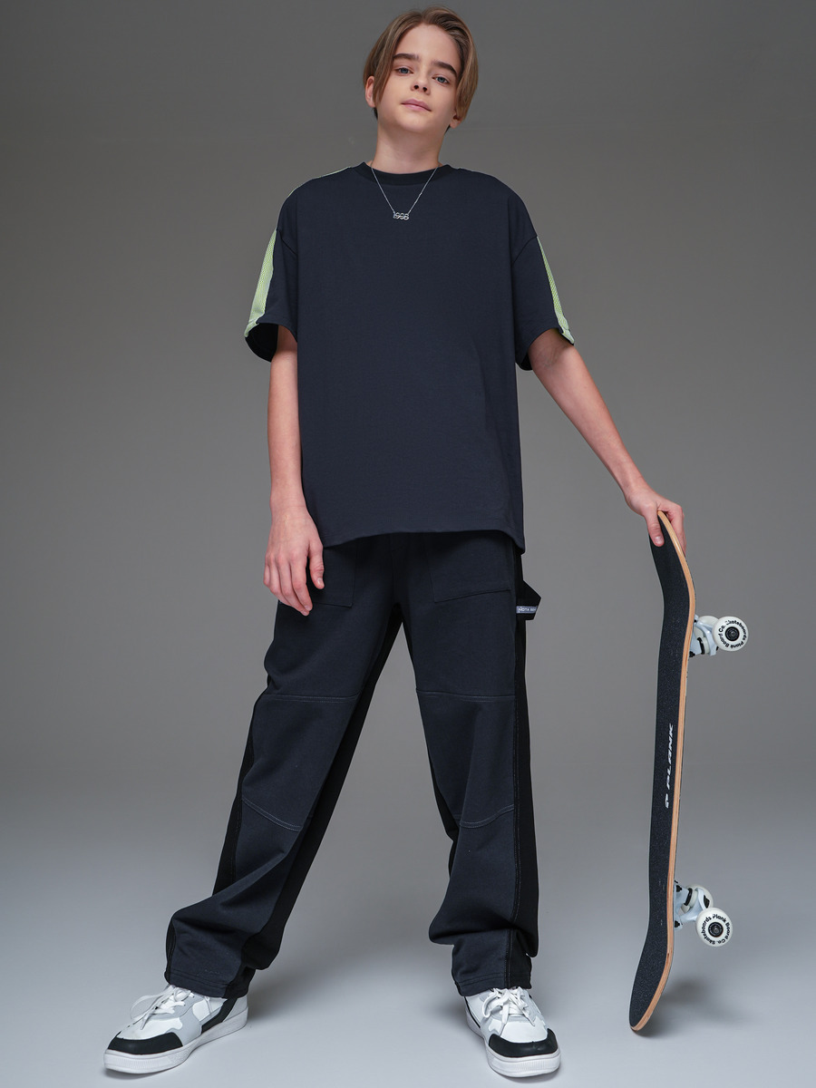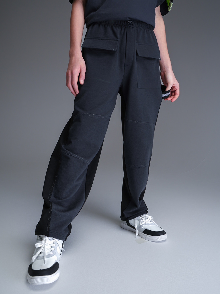 Брюки для мальчика "Релакс" в рабочем стиле, 2-х цветные, из премиального качественного хлопкового пенье футера 2-х нитки с лайкрой. С накладными карманами, с ассиметричнымкроем, пояс на резинке, с декоративной петлей, отделочными контрастными строчками.