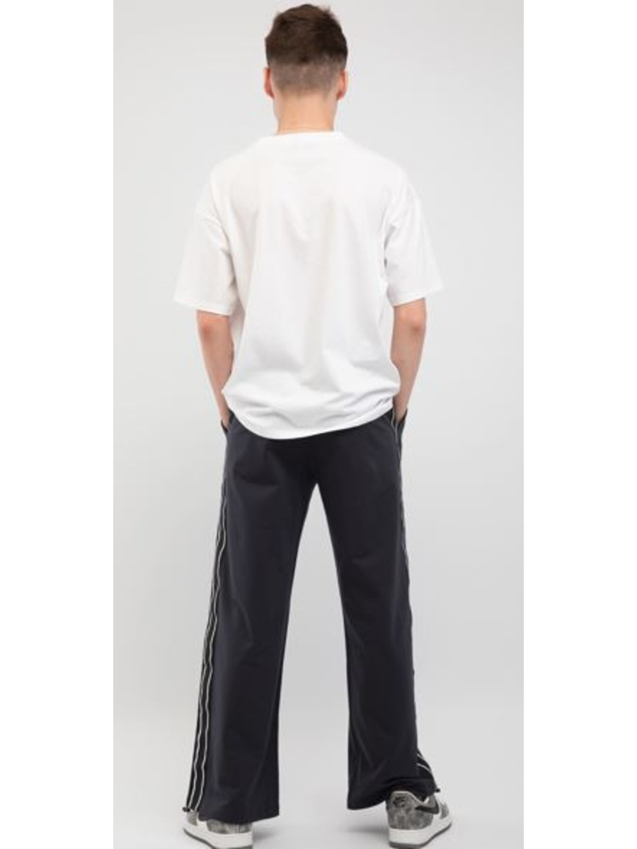 Брюки из трикотажа средней плотности. Пояс на резинке с регулируемыми шнурками для комфортной носки. По бокам полоски в спортивном стиле.