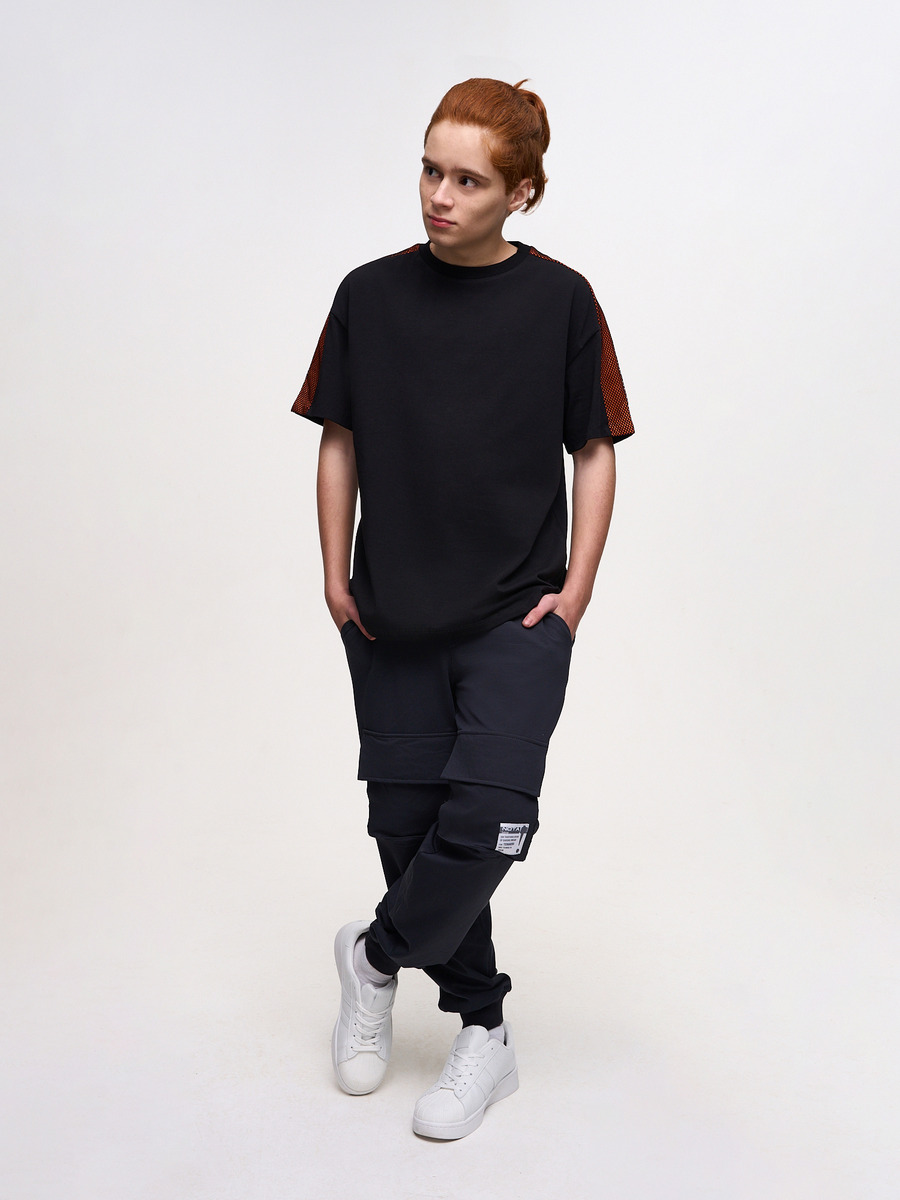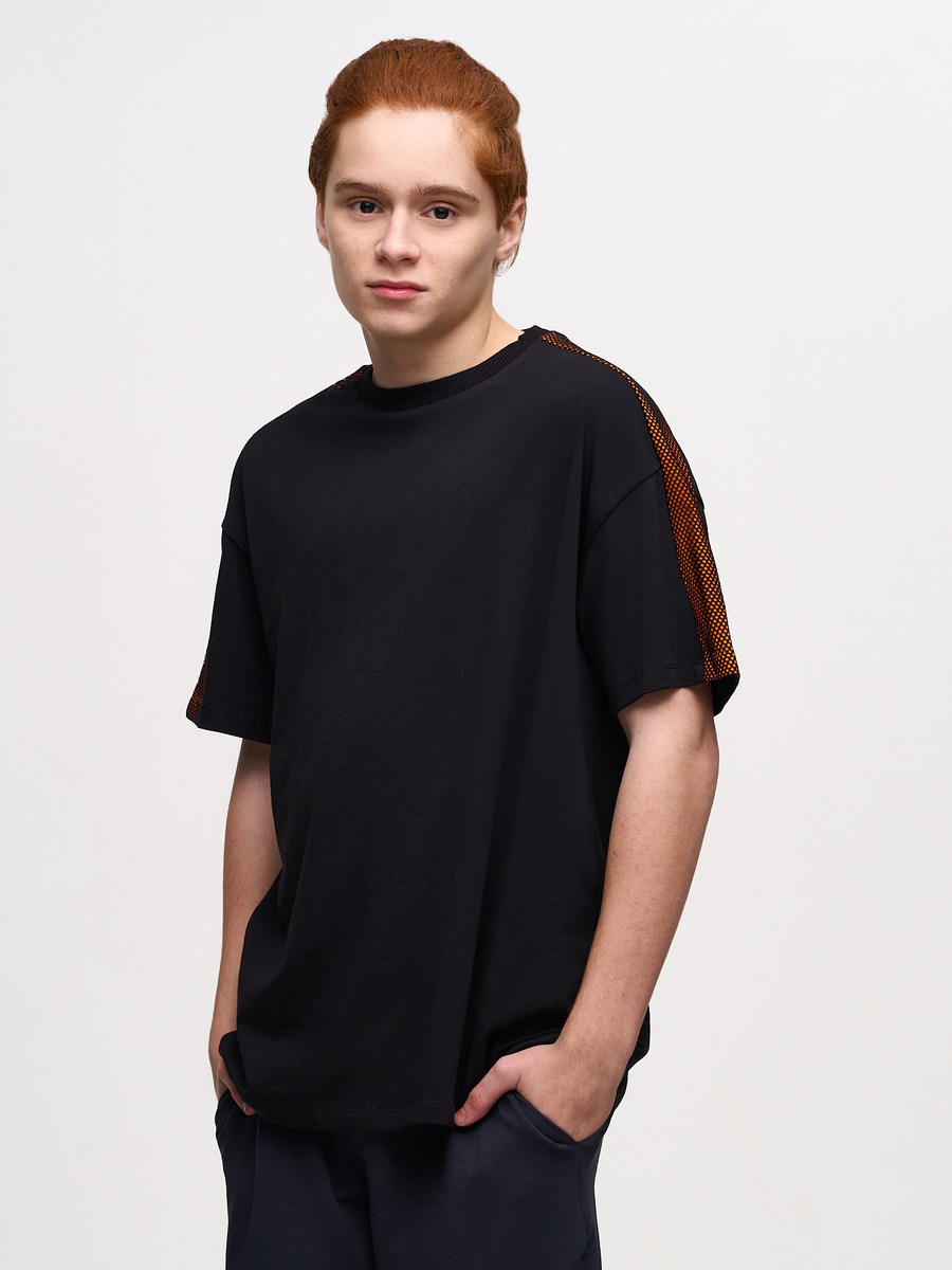 Футболка для мальчика Оверсайз, из премиального качественного хлопкового пенье кулирной глади с лайкрой. Прямого свободного силуэта, со спушенным плечом, с круглой горловиной. Комбинирован контрастной вставкой на плече с сеткой.