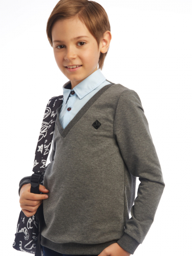 Кардиган для мальчика из трикотажного полотна, прямого силуэта, длиной до середины бедер, с длинными рукавами на манжетах, воротник-шаль, пояс, накладные карманы. По борту притачные планки, застежка на кнопки.