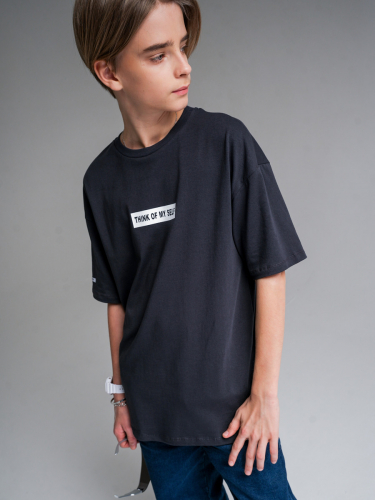 Комплект для мальчика. Тостовка с капюшоном свободного силуэта. На полочке принт. Плечо спущенное, рукав длинный с манжетом по низу, по центру рукава лампас. По низу пояс. Брюки с лампасами прямого силуэта, с карманами в боковых швах. Брюки на поясе с эластичной тесьмой и шнурком внутри. По низу брюк манжеты.