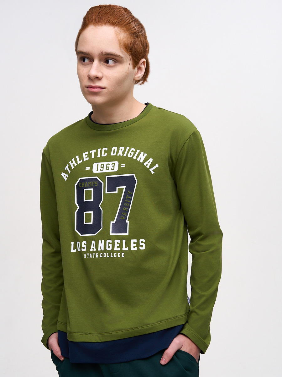Лонгслив для мальчика их кулирной глади с лайкрой прямого силуэта, оверсайс, спущеное плечо, круглая горловина, иммитация двойного низа. Рукав длинный. Спереди принт.