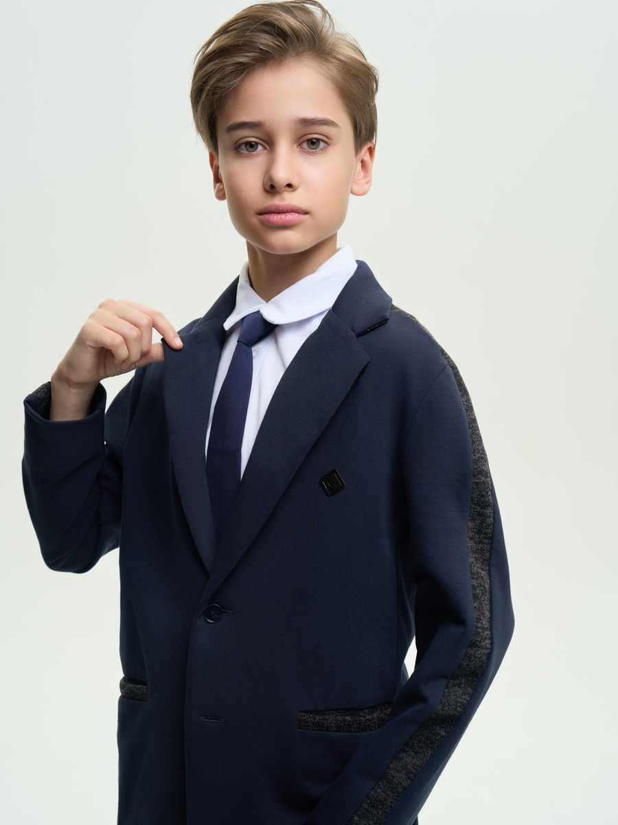 Пиджак для мальчика из трикотажного полотна полуприлегающего силуэта, средней длины с длинными втачными рукавами. С английским воротником и отложными лацканами. На полочках прорезные карманы "листочка", по рукавам и плечевым швам проходят лампасы. Застежка на 2 пуговицы и петли