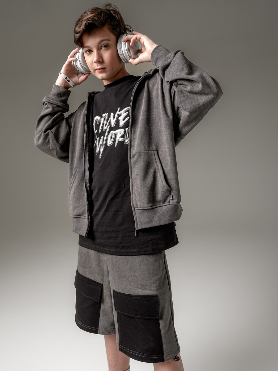 Шорты для мальчика "Релакс" в рабочем стиле, 2-х цветные с эффектом потертости. Из премиального качественного футера 3-х нитки. Широкие, свободного силуэта, ниже колен, с карманами в боковых швах и накладными карманами спереди, по низу на кулиске регулируется резинкой с фиксатором. Пояс на резинке регулируется по ширине.