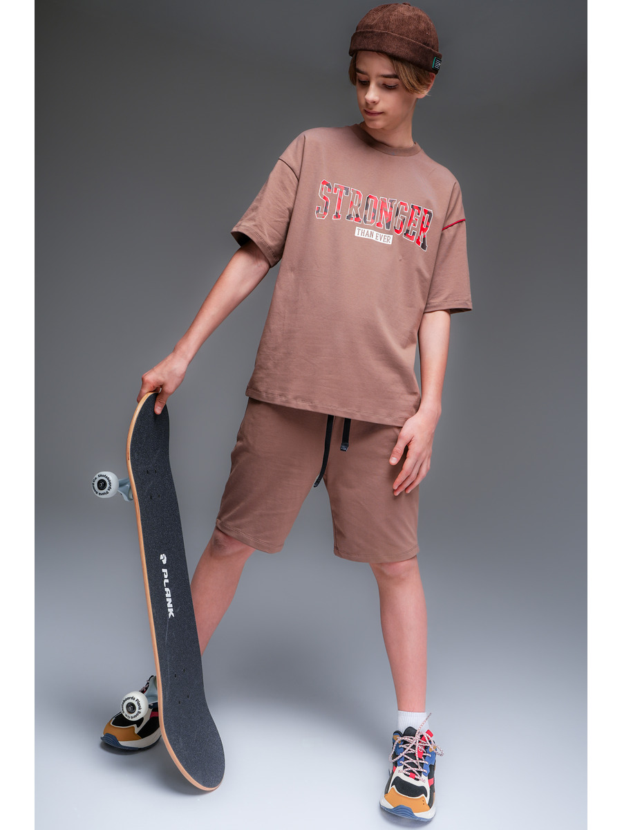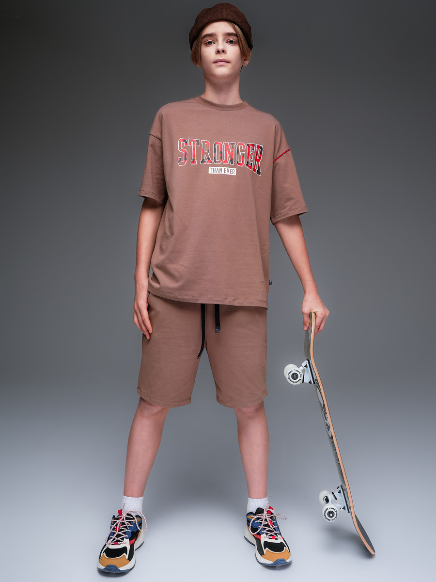 Шорты для мальчика из премиального качественного хлопкового пенье кулирной глади с лайкрой, прямые со средней посадкой. Пояс на резинке, регулируется шнурком, карманы в боковых швах. Декор принт.