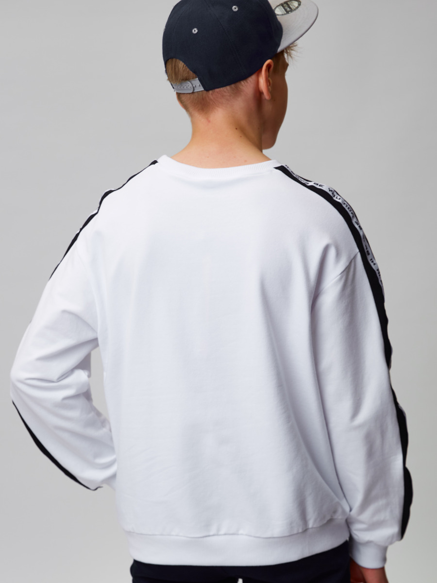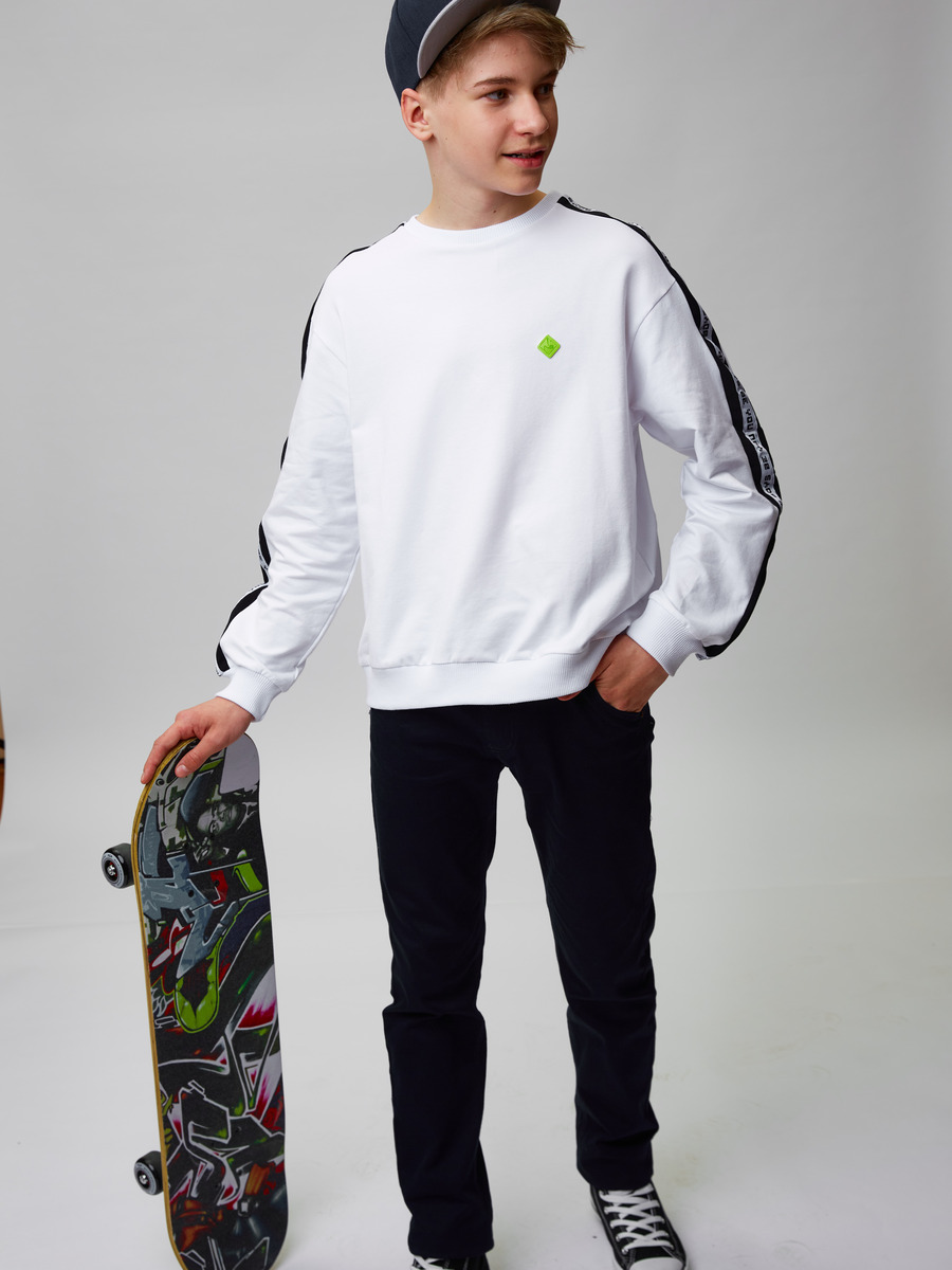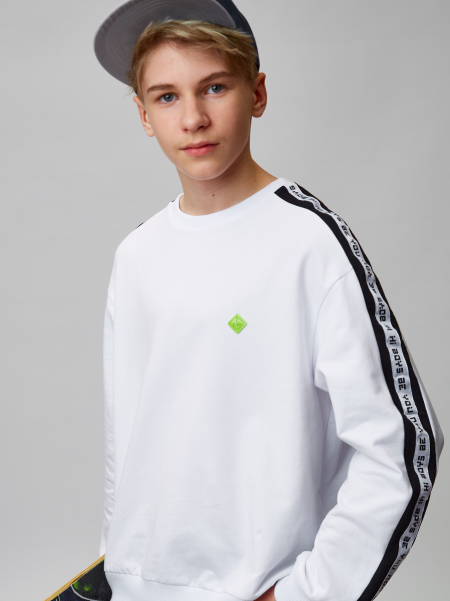Свитшот для мальчика из футера 2-х нитки с лайкрой, свободного кроя, спущенная линия плеча, кругдая горловина. Рукав длинный на манжете. По середине рукава вставка контрасного цвета с тесьмой.