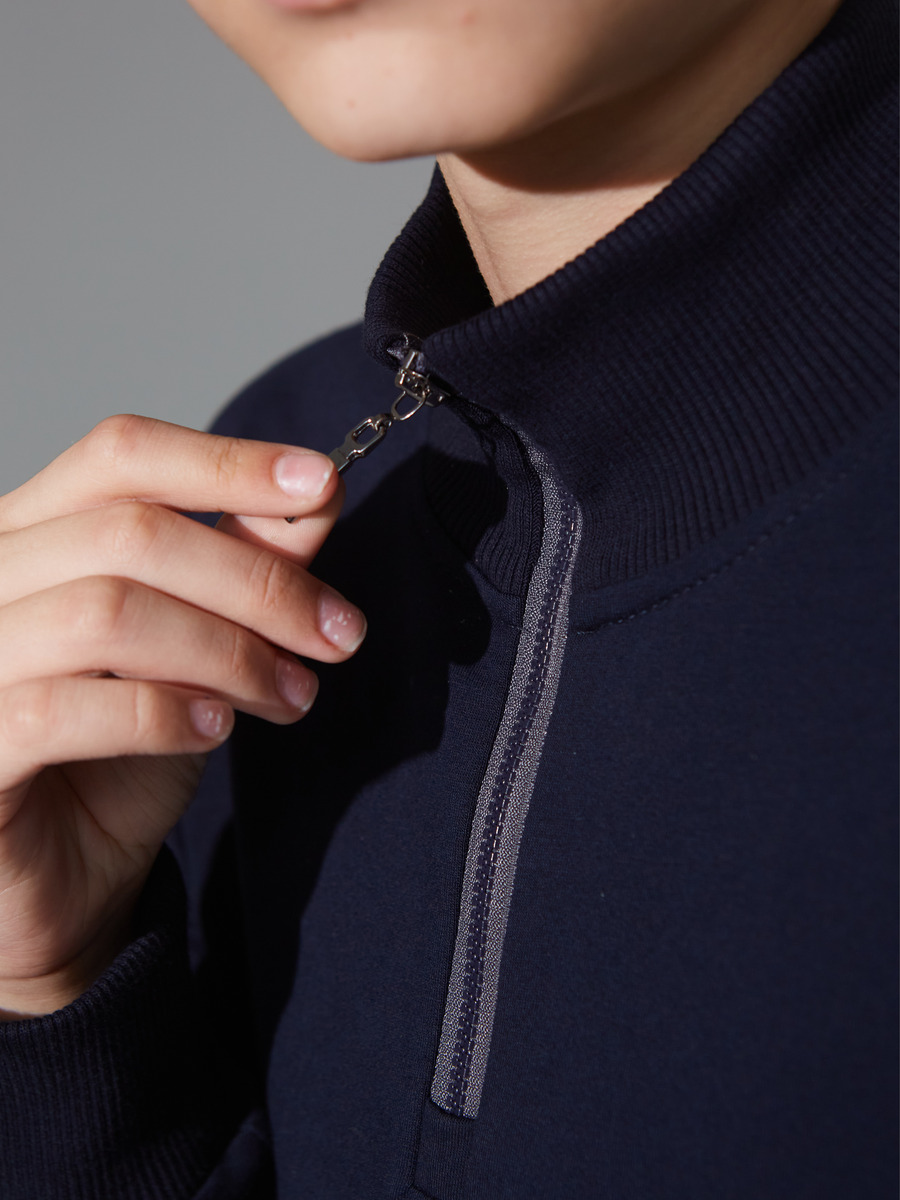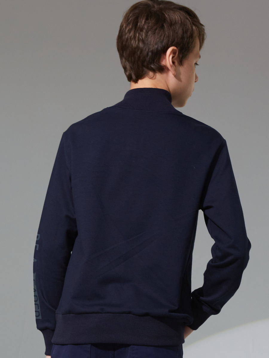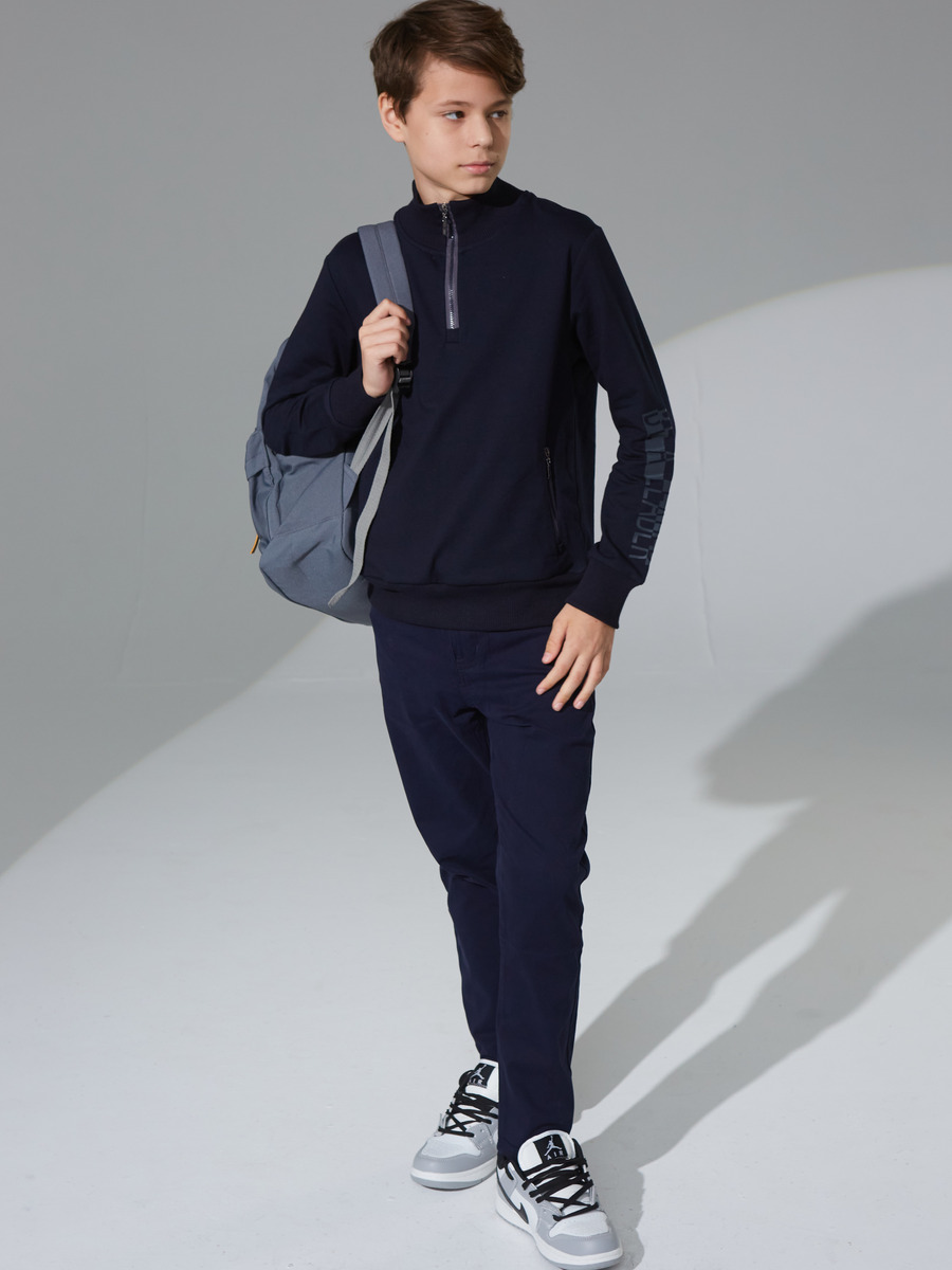 Коллекция школа 2024. Трикотажная Толстовка из хлопкового футера с добавлением эластана качества пенье пл.260 гр/м2. Толстовка для мальчика прямого силуэта для повседневной носки с втачным длинным рукавом на манжете.Застежка горловины и карманы на полочке на молнии, воротник стойка. Пояс, манжеты и воротник из хлопкового кашкорсе с лайкрой. На рукаве износостойкий принт надпись на англиском языке, перевод "Будь лидером".
