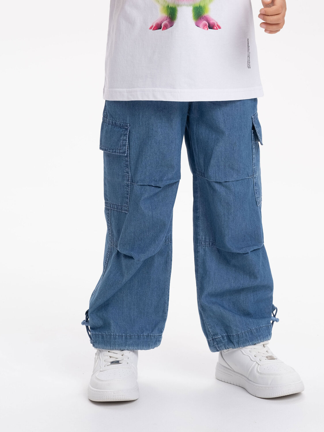Джинсовые брюки карго для мальчиков. Брюки свободного кроя с накладными карманами с клапанами и прорезными боковыми карманами. На спинке справа накладной карман с клапаном. Для придания объема в области коленки на переде заложены складки - модный тренд. По переду имитация гульфика. Внутри пояса шнур для регулировки по талии. По низу брюк предусмотрена регулировка ширины с помощью эластика и стоппера.