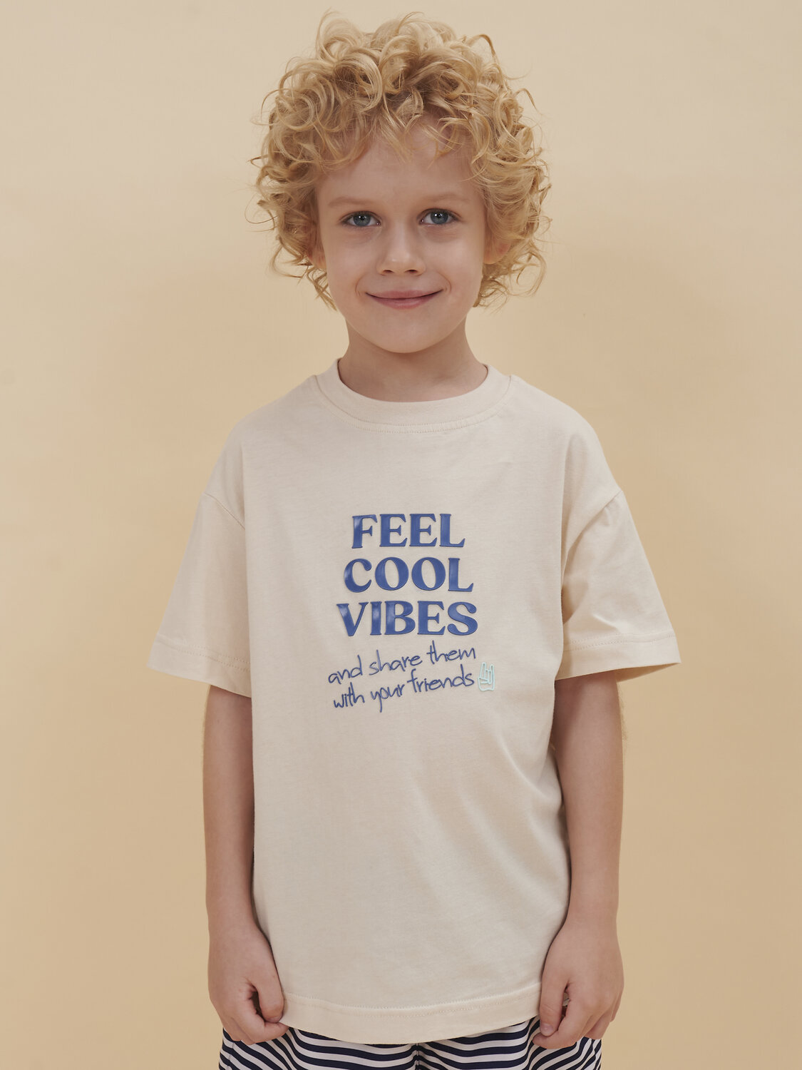 Футболка для мальчика оверсайз – модель большого объема на каждый день, для дома и прогулок. Легкая трикотажная футболка подходит в качестве нательного белья и многослойных образов. Базовая футболка на любой сезон. Изделие сшито из 100% натурального хлопка. Футболка детская для мальчика из мягкого материала приятно прилегает к телу, не вызывая дискомфортных ощущений во время движений. Хлопок хорошо пропускает воздух, обеспечивает гигроскопичность. Материал не задерживает влагу - ребенок не потеет. Футболка с оптимальным размером горловины удобна в носке - позволит ребенку с легкостью надевать и снимать ее самостоятельно. Футболка для мальчика прослужит долго и будет радовать износостойкостью. Модель представлена в двух расцветках на выбор: синий и бежевый. Красивый вариант на любой выход. Футболка для мальчика с принтом украшена надписью "Feel cool vibes and share them with your friends" – перевод "Почувствуй классный вайб и поделись им со своими друзьями". Высокий рабр. Изделие привлекает стильным дизайном. Свободная футболка для мальчика подростковая рассчитана на возраст садика и школы. Размерная линейка: 1 (86): 2 (92): 3 (98): 4 (104): 5 (110): 6 (116): 7 (122): 8 (128): 9 (134): 10 (140): 11 (146). Крутая футболка для мальчика – отличный подарок для сына, внука, братика, племянника, крестника! Выбирайте нужный размер по таблице размеров на фото. Цвет товара на экране вашего устройства может отличаться от цвета изделия вживую.