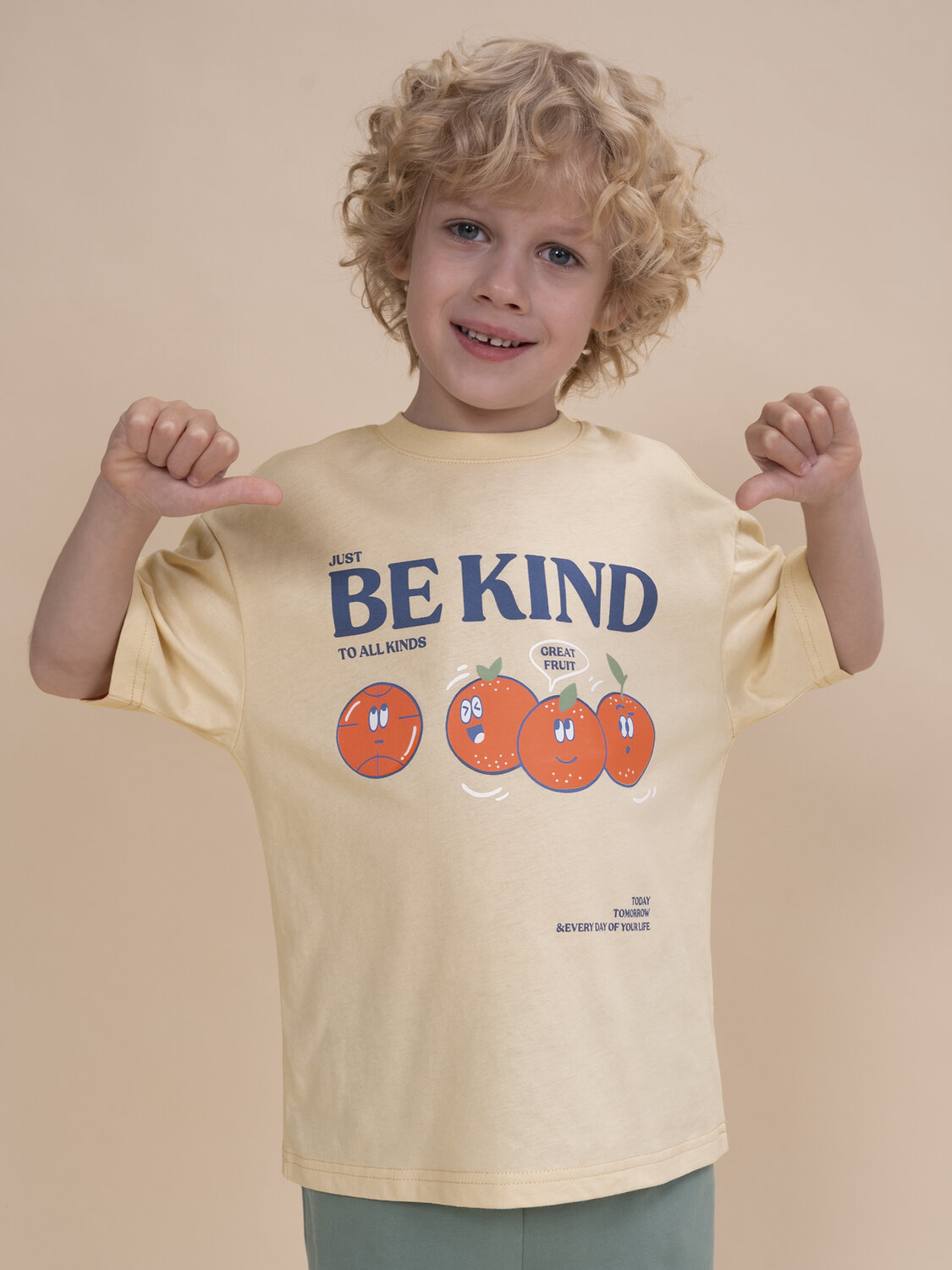 Футболка детская – модель умеренного объема на каждый день, для дома и прогулок. Легкая трикотажная футболка подходит в качестве нательного белья и многослойных образов. Базовая футболка на любой сезон. Изделие из 100% натурального хлопка, мягкий материал приятно прилегает к телу, не вызывая дискомфортных ощущений во время движений. Хлопок хорошо пропускает воздух, обеспечивает гигроскопичность. Материал не задерживает влагу - ребенок не потеет. Детская футболка с оптимальным размером горловины удобна в носке - позволит ребенку с легкостью надевать и снимать ее самостоятельно, прослужит долго и будет радовать износостойкостью. Модель представлена в бежевом цвете. Универсальный вариант на любой выход. Футболка для мальчика с принтом украшена надписью "Just be kind to all kind today tomorrow & every day of your life" – перевод "Просто будь добрым ко всем сегодня завтра и каждый последующий день". На картинке изображены фрукты и мячик с эмоцией веселого настроения. Изделие привлекает забавным дизайном. Футболка для мальчика подростковая рассчитана на возраст садика и школы. Размерная линейка: 1 (86): 2 (92): 3 (98): 4 (104): 5 (110): 6 (116): 7 (122): 8 (128): 9 (134): 10 (140): 11 (146). Крутая футболка для мальчика – отличный подарок для сына, внука, братика, племянника, крестника! Выбирайте нужный размер по таблице размеров на фото. Цвет товара на экране вашего устройства может отличаться от цвета изделия вживую.