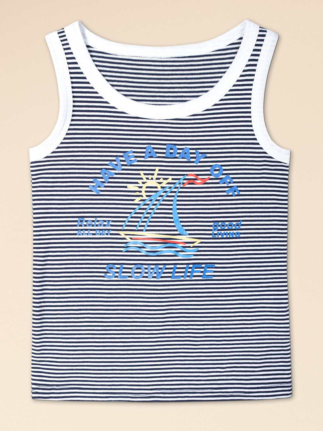 Если вы в поисках качественного, комфортного и стильного белья для своего ребёнка, обратите внимание на нашу майку из 100% хлопка для мальчика. Натуральный состав ткани обеспечивает изделию мягкость и воздухопроницаемость — кожа ребёнка дышит. Майка детская комфортно сидит по фигуре, её можно надевать под рубашку, джемпер, свитер. Горловина и проймы изделия отделаны белым пайпингом — они хорошо держат форму, надолго сохраняют аккуратный внешний вид. Хлопковая майка в полоску украшает позитивный принт в виде парусника и солнышка. Надписи переводятся: "отдых", "отдыхать целый день", "хорошая жизнь", "медленная жизнь". Принт эластичный и прочный — отлично переносит частые стирки. В линейке представлены майки детские следующих размеров: 1 (86): 2 (92): 3 (98): 4 (104): 5 (110): 6 (116): 7 (122): 8 (128): 9 (134): 10 (140): 11 (146). Нательная майка для мальчика подходит для повседневной носки, отдыха, а также для сна и дома — прекрасный выбор для вашего ребёнка! Изделие можно носить круглый год: летом, весной и осенью (демисезон), зимой. Майка детская для мальчиков — замечательный подарок сыну, внуку, брату на любой праздник. Выбирайте нужный размер по таблице размеров на фото. Цвет товара на экране вашего устройства может отличаться от цвета изделия вживую. Товар возврату и обмену не подлежит.