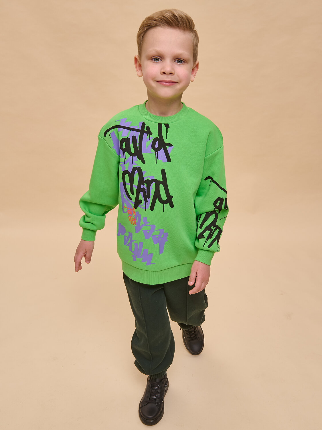 Свитшот детский для мальчика. Свободная толстовка со спущенным плечом и углубленной проймой подарит ребёнку комфорт и не будет стеснять его движений. Объёмный джемпер средней длины — актуальный модный тренд. Манжеты, отделка горловины и низа изделия выполнены из эластичной рибаны (ткани в рубчик). Она не растягивается, отлично сохраняет форму, при этом ребёнку удобно надевать и снимать свитшот. Модель неприхотлива в уходе. Свитшот с принтом по переду и на левом рукаве выполнен из футера с начёсом. Принты мягкие и эластичные, великолепно переносят частые стирки. Надписи переводятся: «не в себе», «смешанные чувства». В составе ткани преобладает высококачественый хлопок — толстовка приятна на ощупь и прекрасно пропускает воздух. Полиэстер помогает сохранить цвет и первозданный внешний вид надолго. Детский свитшот выполнен в модном желтом цвете. Размерная линейка: 1 (86): 2 (92): 3 (98): 4 (104): 5 (110): 6 (116): 7 (122): 8 (128): 9 (134): 10 (140): 11 (146). Оверсайз-свитшот подходит как для маленьких мальчиков, так и для подростков. Джемпер идеален для детского сада, прогулок, активного отдыха, дома. Свитшот с начесом можно носить круглый год: весной и осенью (демисезон), зимой, в прохладную погоду летом. Это отличный подарок сыну, внуку, брату или племяннику на любой праздник.