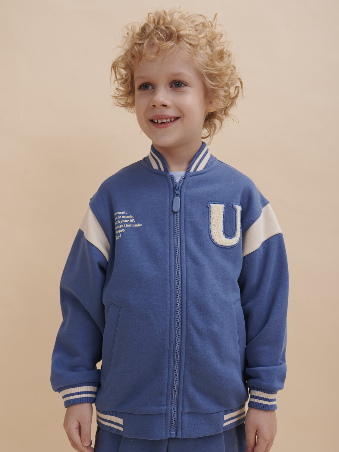 Бомбер для мальчика – трикотажная модель свободного кроя на позднюю весну, лето. Уютная вещь для создания стильного образа. Жакет для мальчика легко сочетать с любым низом, использовать для многослойных образов. Куртка бомбер для мальчика идеальна в качестве плотной кофты для прохладного помещения. Трикотажная куртка выполнена из смесовой ткани с высоким содержанием хлопка и небольшим добавлением полиэстера. Материал хорошо пропускает воздух, обеспечивает здоровую гигроскопичность. Ребенок не потеет и комфортно чувствует себя во время активных игр и занятий спортом. Наличие полиэстера наделяет жакет для мальчика повышенной износоустойчивостью к усадке, защитой от образования катышек. Изделие не линяет после стирки и сохраняет красивый внешний вид. Детский бомбер на центральной застежке молнии, со спущенным плечом и углубленной проймой. Воротник, манжеты по рукавам и низу изделия - из декоративного полосатого риба – стильная резинка в университетском стиле. На рукавах вставки из основного материала контрастного цвета. Боковые карманы с листочками расположены на переде под наклоном. Детский жакет для мальчика украшен модным университетским шрифтом с засечками. Перед декорирован нашивкой – объемной мягкой аппликацией из бербер-флиса (барашек) и графичной шрифтовой композицией. Меховая нашивка буквой "U": unity – перевод "единство, командная сплоченность". Надпись: "Be present, listen to music, be with you BF, do things that make you happy #enjoy!" - перевод "Живи в моменте, слушай музыку, встречайся со своим лучшим другом, делай то, что делает тебя счастливым #наслаждайся!". На спине круговая шрифтовая композиция: "Feeling good always trendy" - перевод "Хорошее настроение всегда в тренде (модно)". Куртка бомбер для мальчика подростка представлена в размере для малышей и школьников. Размерная линейка: 1 (86): 2 (92): 3 (98): 4 (104): 5 (110): 6 (116): 7 (122): 8 (128): 9 (134): 10 (140): 11 (146). Бомбер для мальчика - отличный подарок для сына, внука, братика, племянника, крестника! Выбирайте нужный размер по таблице размеров на фото. Цвет товара на экране вашего устройства может отличаться от цвета изделия вживую.